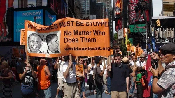 "Сколько бомбардировок за рубежом совершил на беспилотных самолетах Джордж Буш? Сто! А лауреат Нобелевской премии мира Барак Обама - уже 800!", - агитировала на Таймс-сквер против войны активистка. На ее майке была написана новая кличка Обамы - "Обомба".