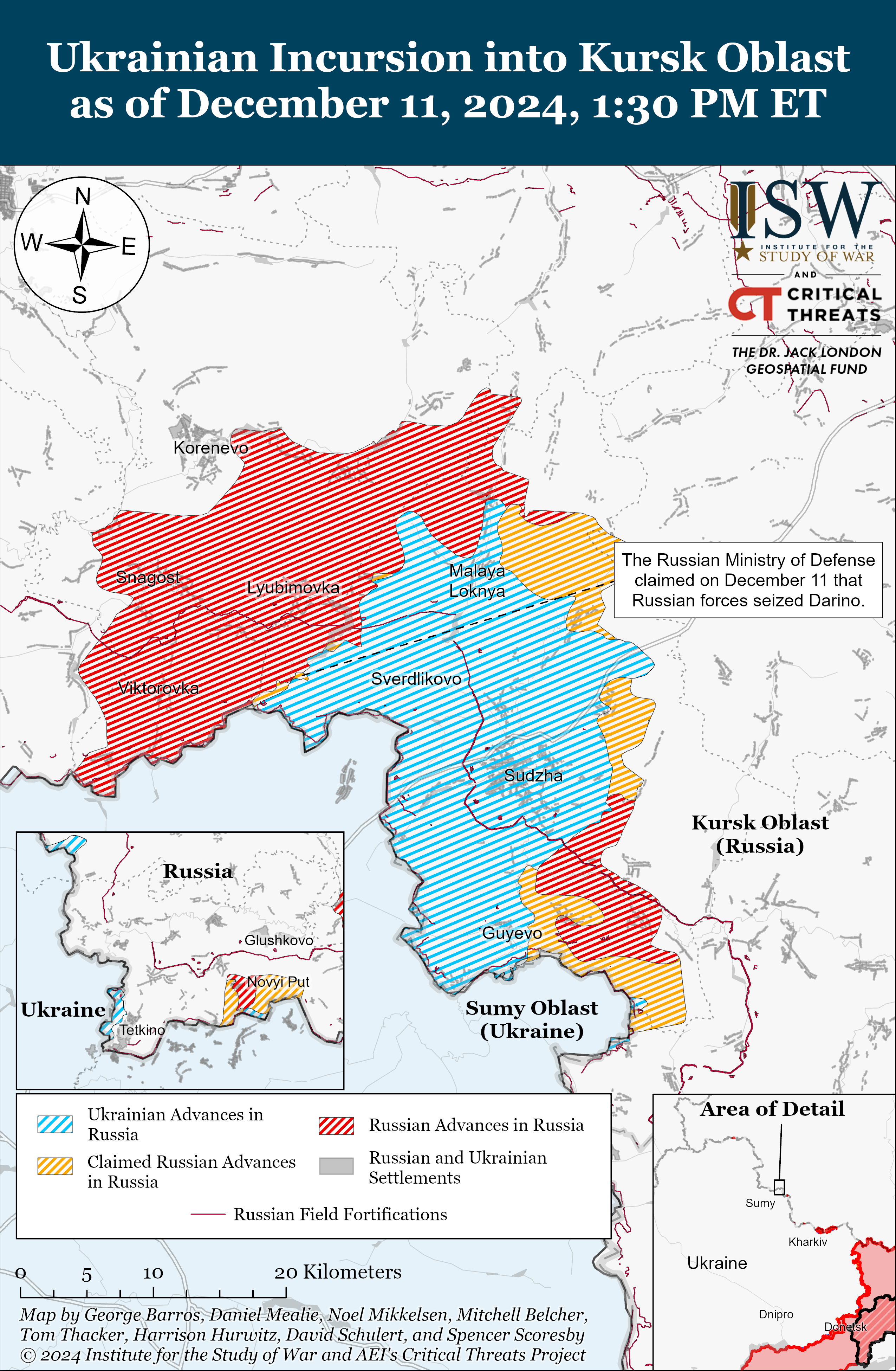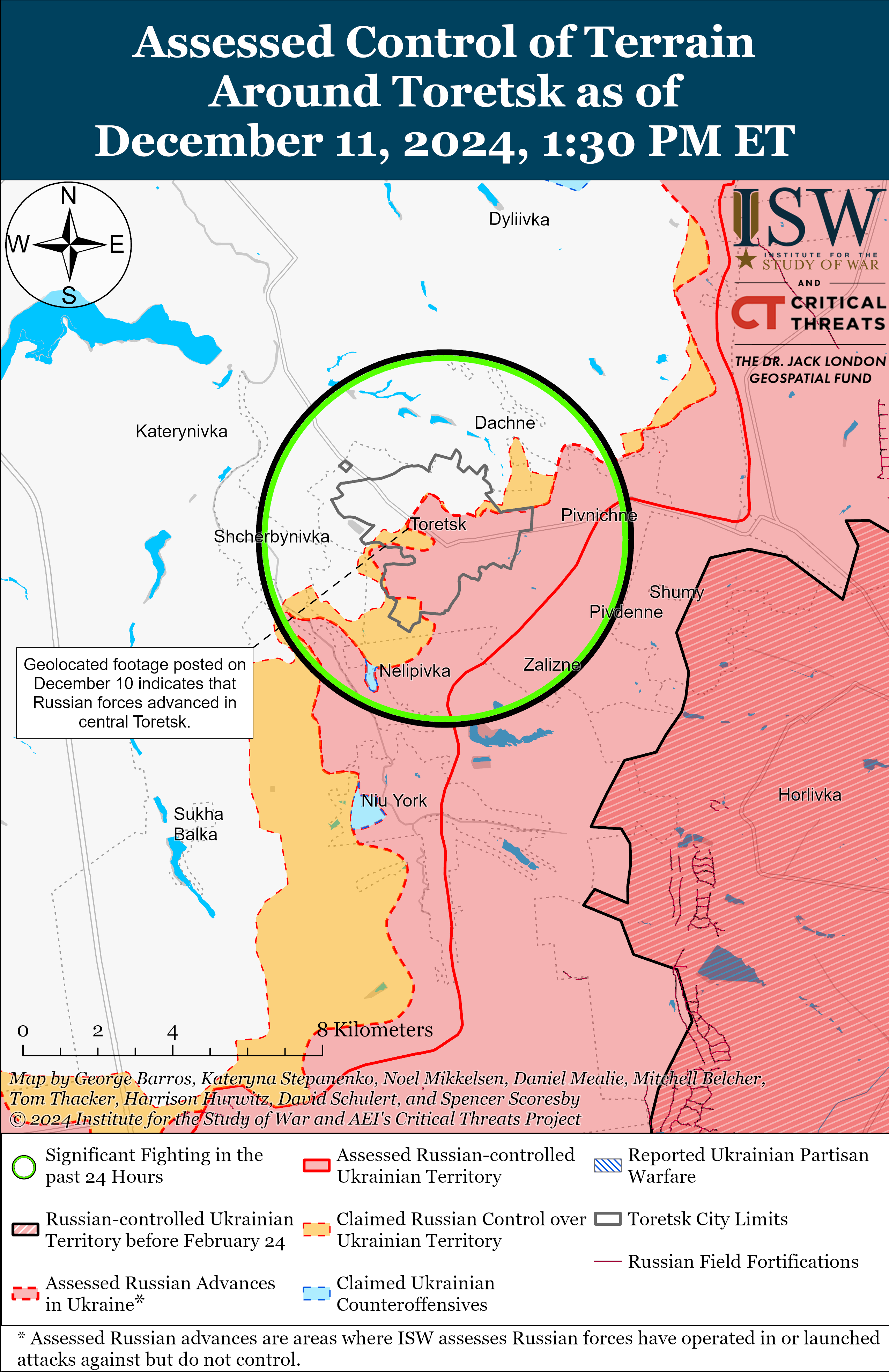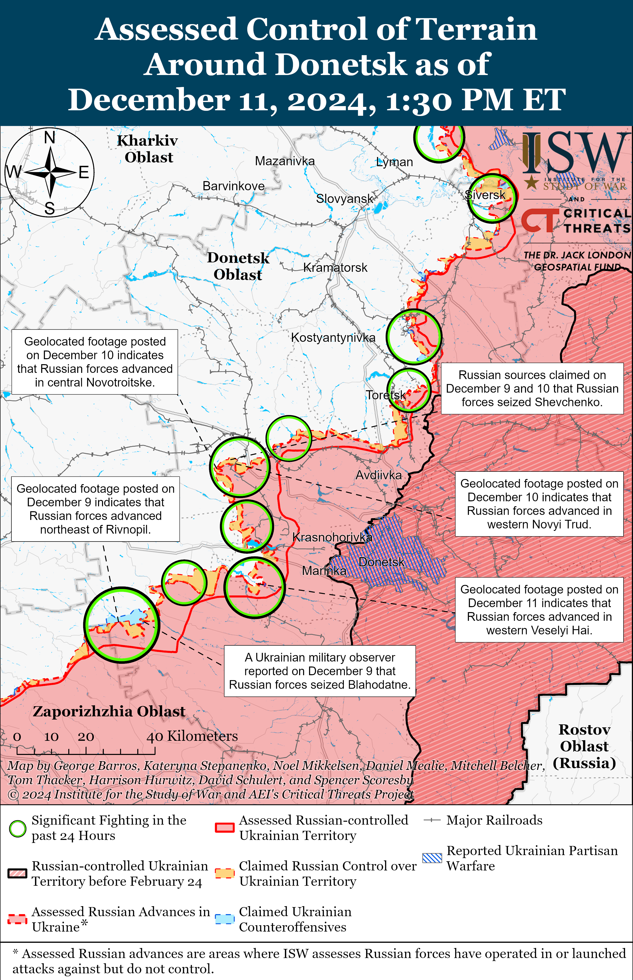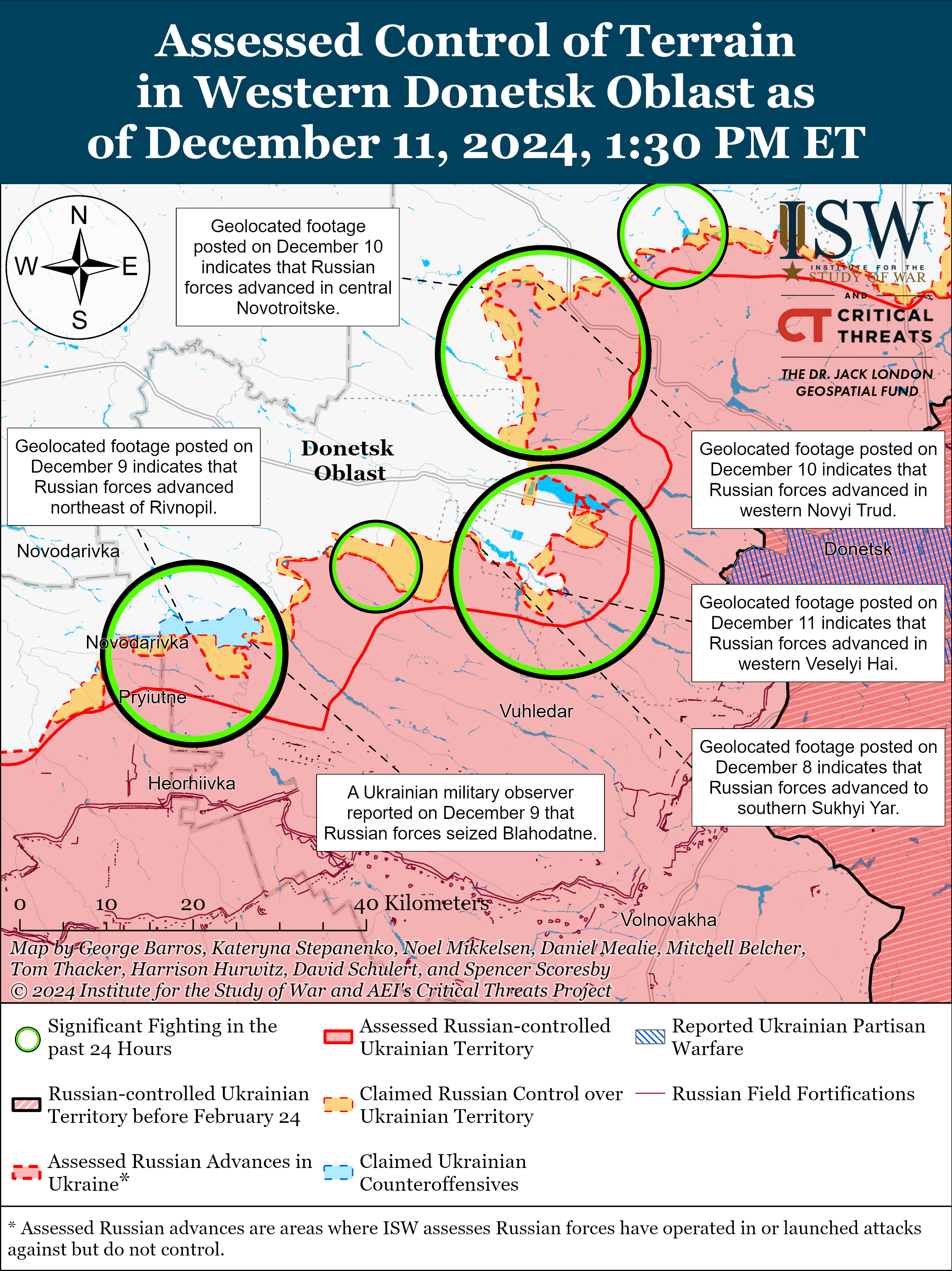- 10 и 11 декабря россияне продолжали наступательные действия на Харьковском направлении, но подтвержденных продвижений не сделали. Россияне утверждали, что продвинулись к Волчанску, но ISW не нашел подтверждения этого заявления.