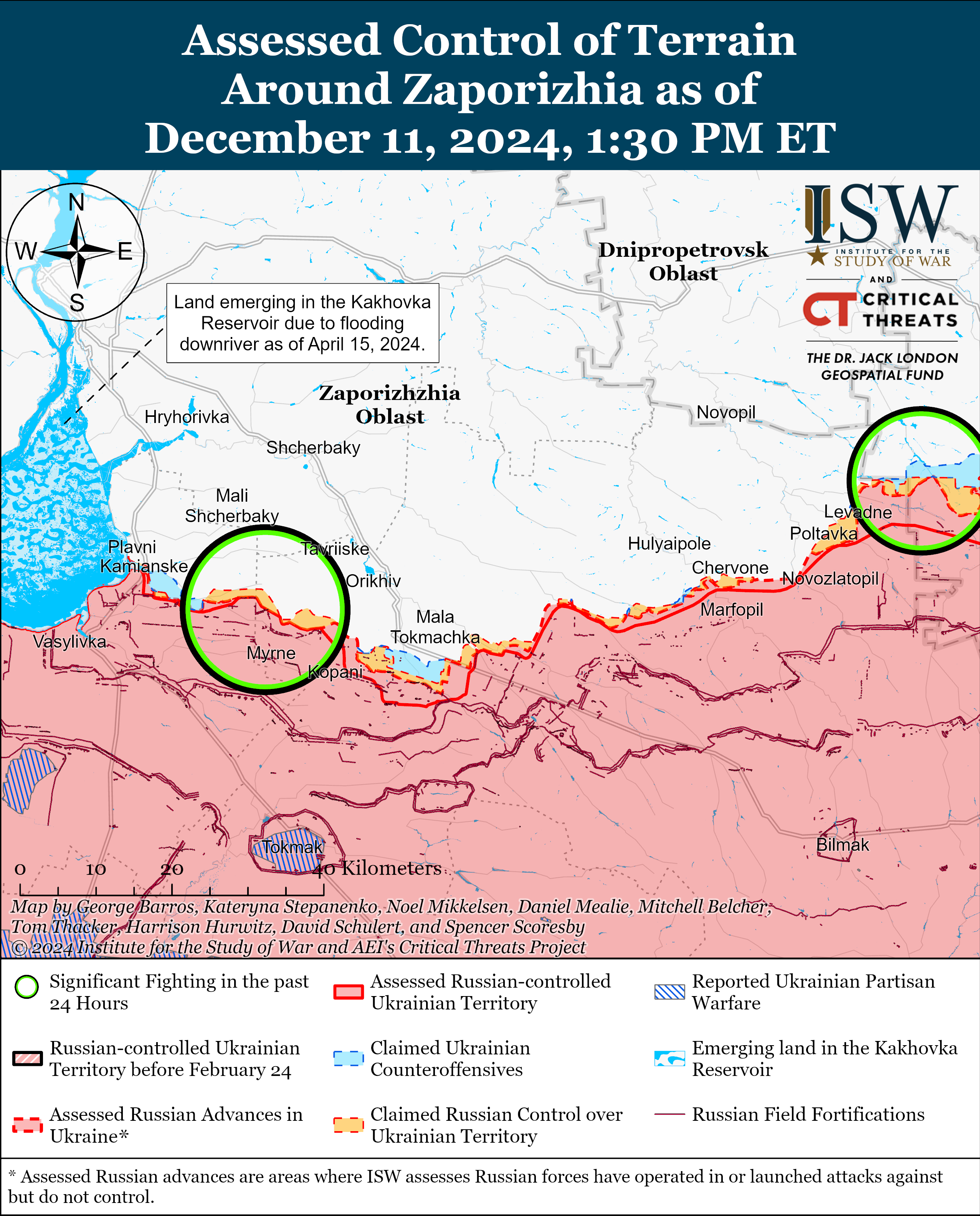 - 10 и 11 декабря россияне продолжали наступательные действия на западе Запорожской области в районе Новоандреевки и Пятихаток, но не продвигались. На Днепровском направлении, в частности возле острова Казацкий, тоже наступали, но не продвинулись.