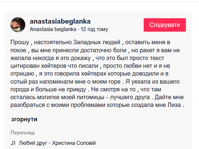 Кускевич, которая переехала во Львов из Никополя, в конце концов, оставила и этот город. Об этом стало известно из публикаций блогера в соцсетях. 31 октября она обнародовала в тиктоке текст, где написала: "Выгнали из Львова, хорошо, нога моя туда больше не ступит".