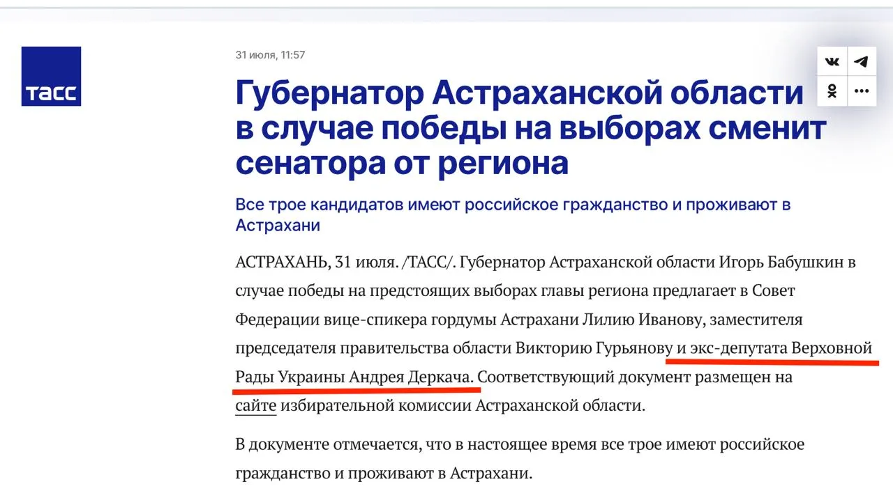 Пропагандистские СМИ России пишут, что губернатор Астраханской области в случае победы на выборах главы региона предлагает в Совет чиновников, среди которых оказался и бывший народный депутат Андрей Деркач.
