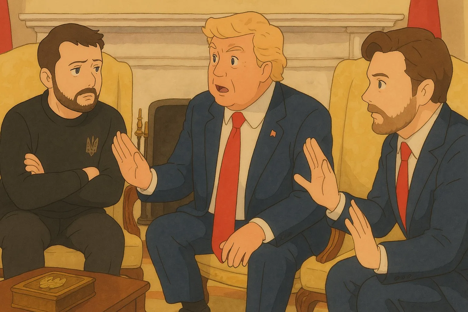 Встреча Зеленского, Трампа и Вэнса в Белом доме в стиле Миядзаки / Сгенерировано ChatGPT