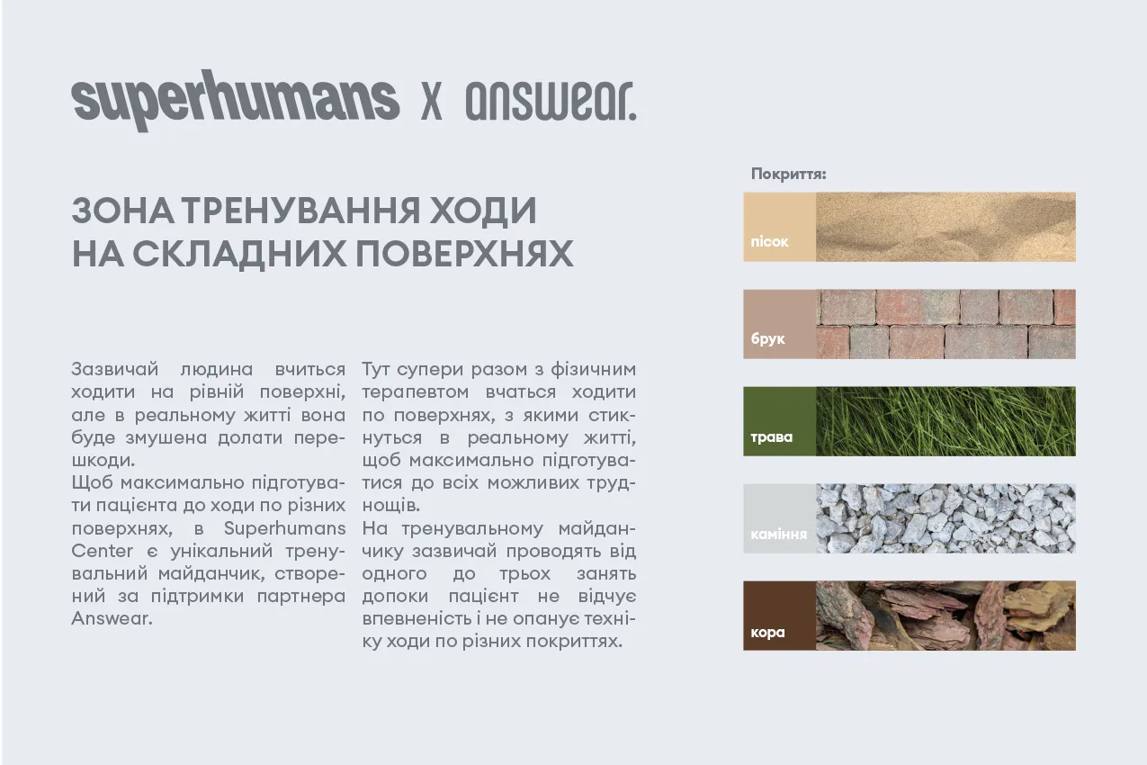 Сейчас в Украине в очереди на протезирование – более 20 тысяч человек. У каждого из них впереди сложный период физической реабилитации. Наши несокрушимые суперлюди проявляют огромное мужество и выдержку. Чтобы поддержать героев, компания ANSWEAR запустила большую благотворительную кампанию. Ее результатом стало комфортное тренировочное пространство для людей с протезами. Оно облегчит процесс реабилитации и поможет быстрее вернуться к активному ритму жизни.