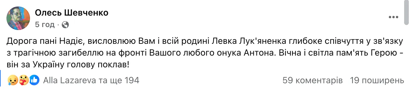 Дорогая Надежда (вдова Левка Лукьяненко – 24 Канал), выражаю Вам и всей семье Левка Лукьяненко глубокое соболезнование в связи с трагической гибелью на фронте Вашего любимого внука Антона. Вечная и светлая память Герою – он за Украину голову положил!