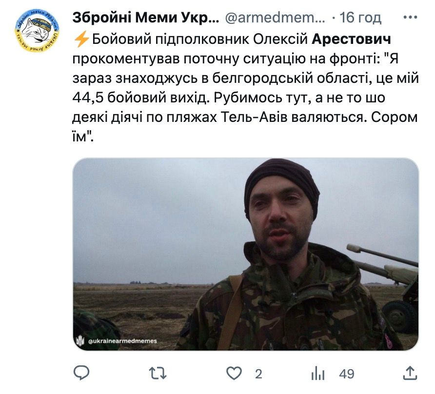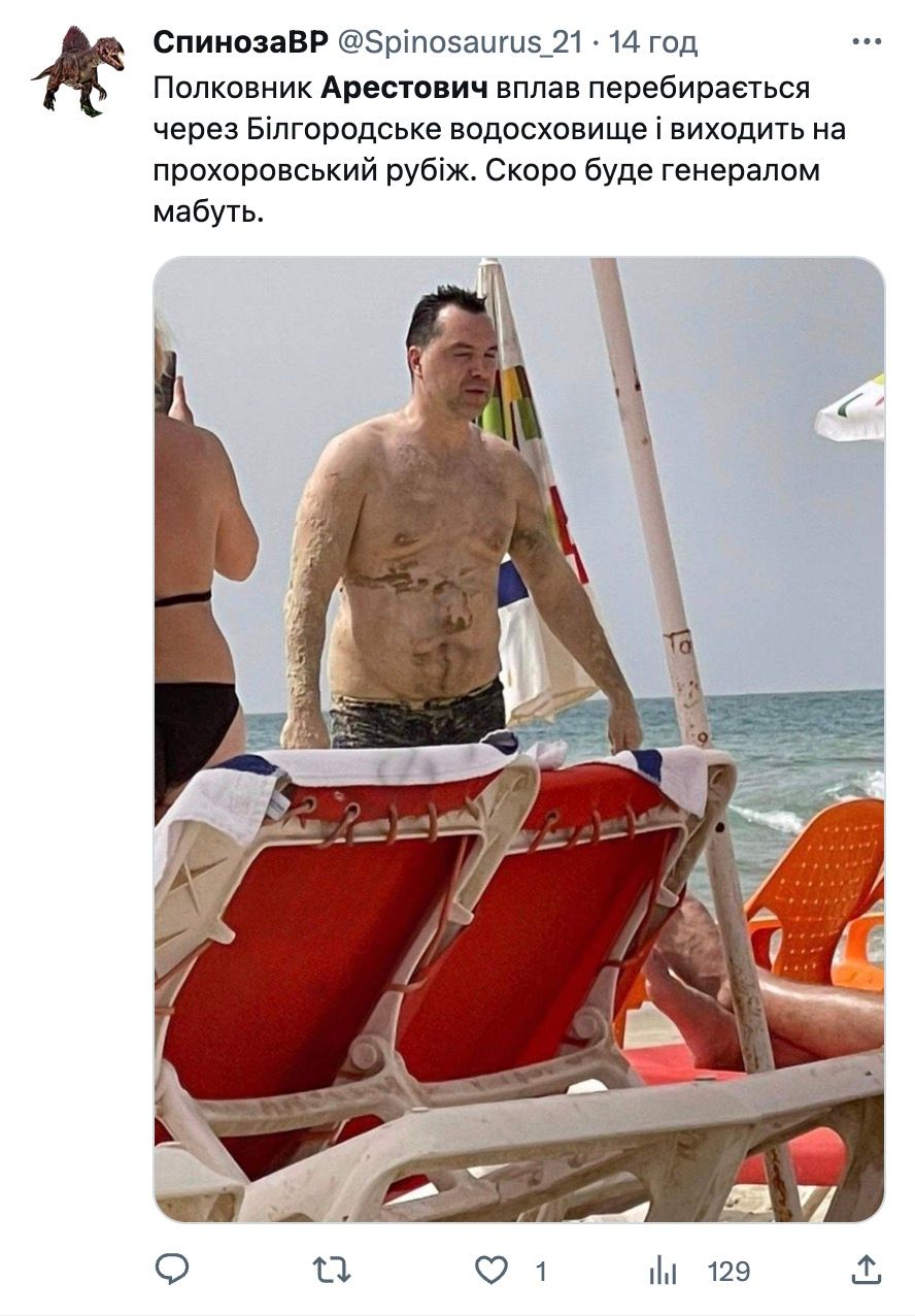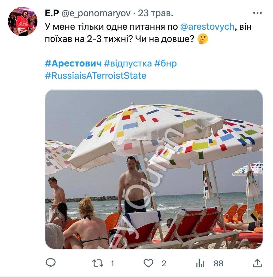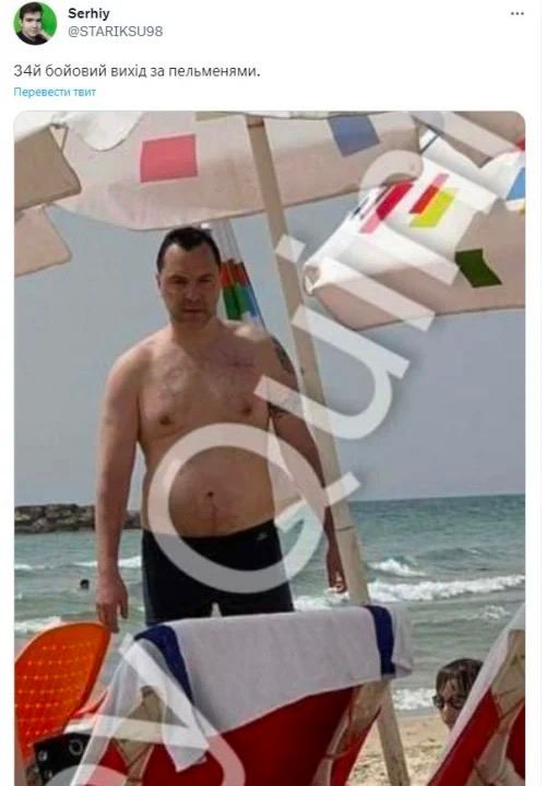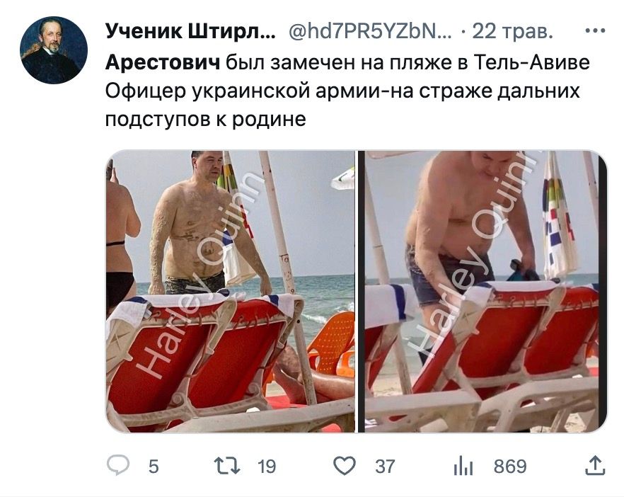 - "Арестович был замечен на пляже в Тель-Авиве. Офицер украинской армии на страже дальних подступов к Родине".