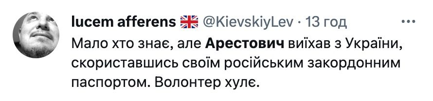 - "Мало кто знает, но Арестович уехал из Украины, воспользовавшись своим российским загранпаспортом".