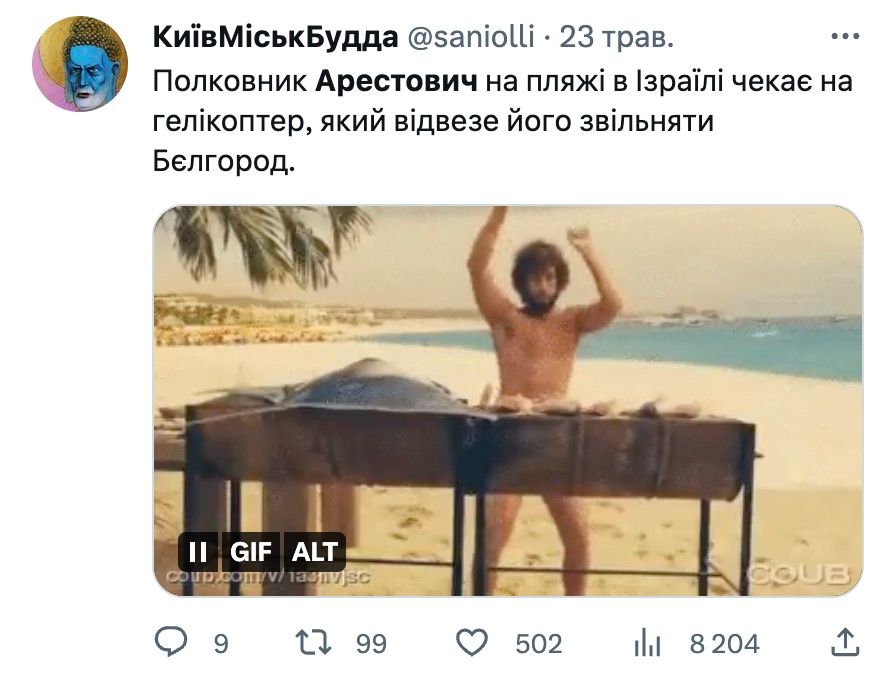 - "Полковник Арестович на пляже в Израиле ждет вертолет, который отвезет его освобождать Белгород";