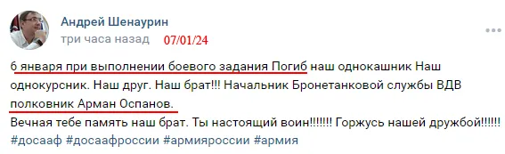 Однокурсник полковника Андрей Шенаурин в сети начал жаловаться на смерть Оспанова. Он рассказал, что он погиб 6 января.
