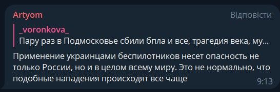 Лишь один человек в комментариях к одному из постов отметил, что эти БПЛА запускались где-то из Подмосковья, однако это сообщение все проигнорировали. Ведь думать им довольно сложно, остается демонизировать украинцев.