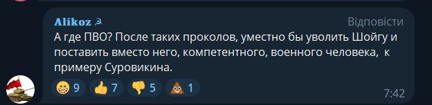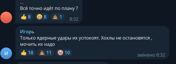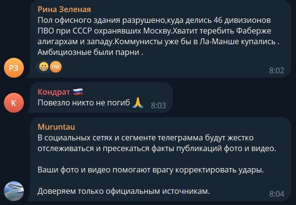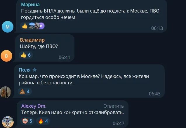 Не обошлось и без традиционных призывов наносить удары по гражданскому населению и украинским городам. Хотя некоторые пользователи возмущены, что им рассказывали басни о так называемой "второй армии мира", а на самом деле – неизвестные беспилотники могут долететь до центра Москвы. Однако самые смелые решили открыто заявить, что таких действий следовало ожидать, ведь Россия развязала войну против Украины.