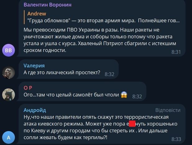 Это привело к настоящей истерике среди россиян. Как россияне жалуются на работу ПВО и призывают уничтожать украинские города – передает 24 Канал.