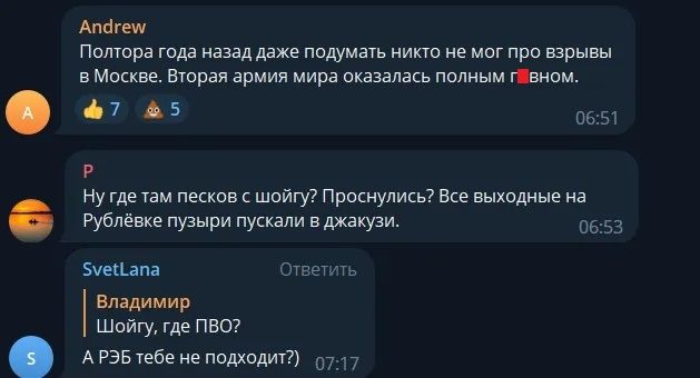 Россияне возмущались, что хваленая противовоздушная оборона не смогла уничтожить беспилотники. Часть также критиковала и средства радиоэлектронной борьбы – мол, почему дроны не заглушили раньше. Некоторые храбрецы начали критиковать и непосредственно российского министра обороны Сергея Шойгу и спикера Путина Дмитрия Пескова.