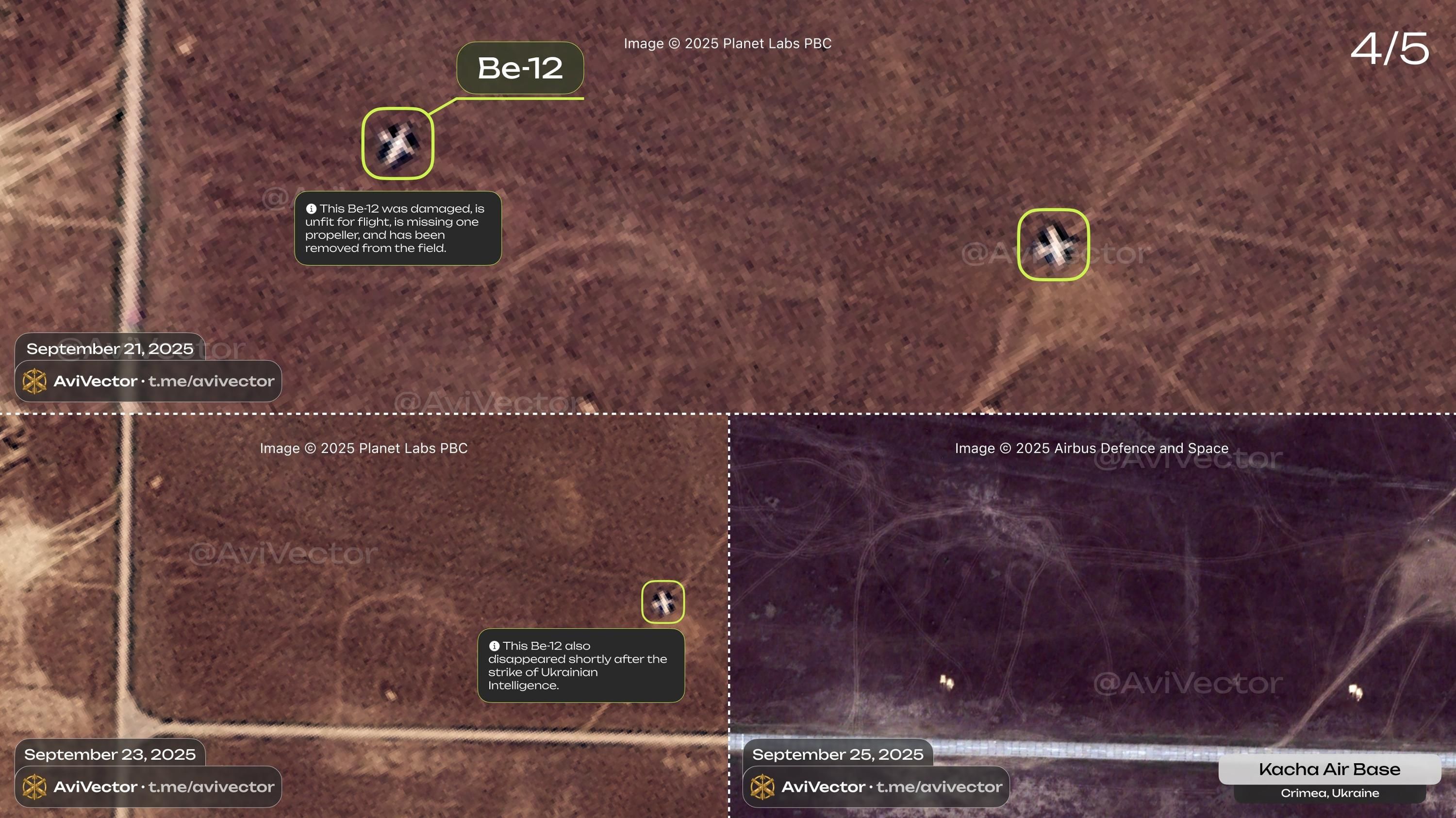 Кроме того, на снимках видно кратер от удара вблизи одного из Бе-12, который, вероятно, не получил повреждений. Оккупанты вывезли с базы 2 самолета Бе-12, один из которых стоял на поле и был поражен.