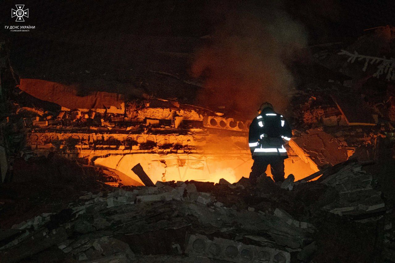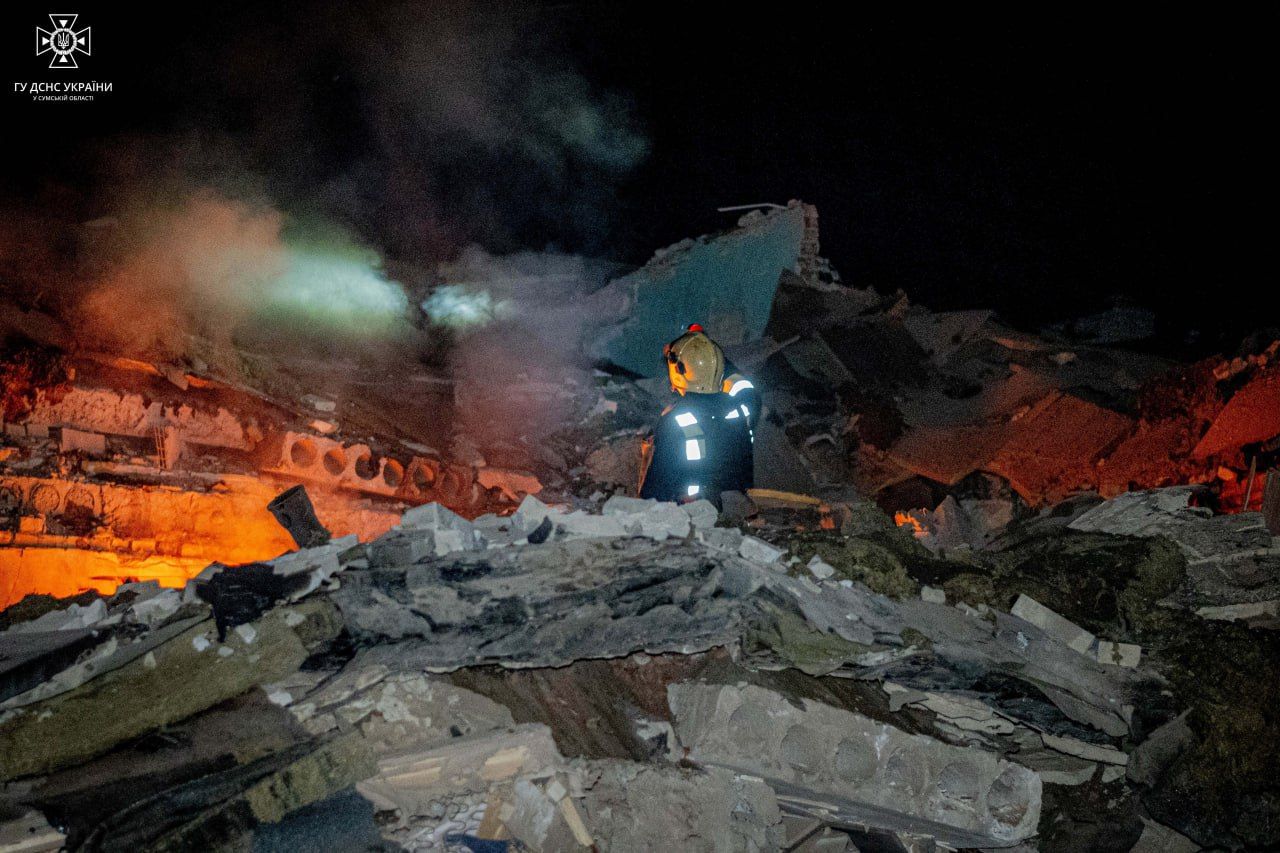 В результате попадания разрушены несколько этажей трехэтажного дома и возник пожар площадью 450 квадратных метров, который огнеборцы ликвидировали в 07:45. Продолжается разбор завалов.