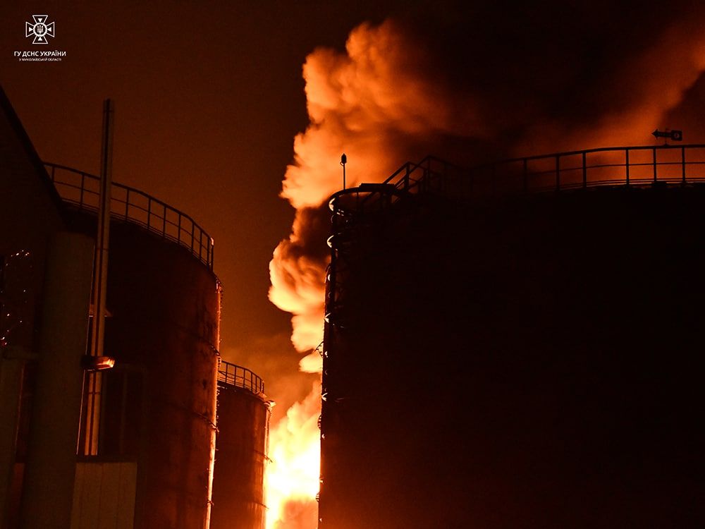По информации ГСЧС, загорелись два резервуара с непереработанным маслом. Пресс-офицер Николаевской ОВА Дмитрий Плетенчук напомнил, что этот терминал уже во второй раз испытывает удар россиян.