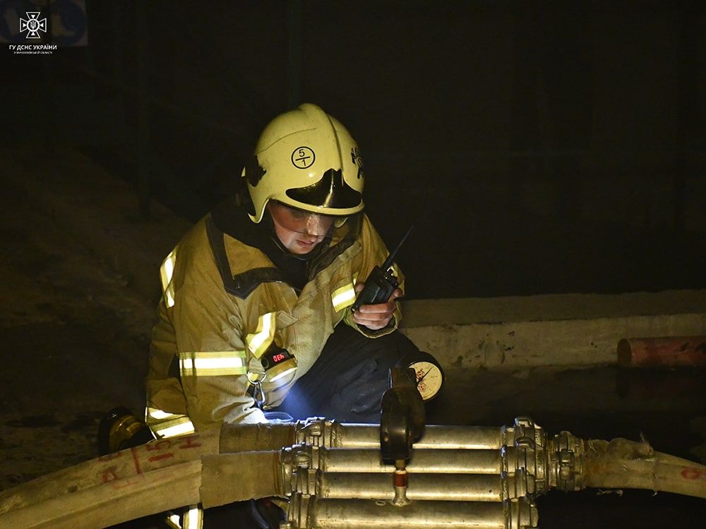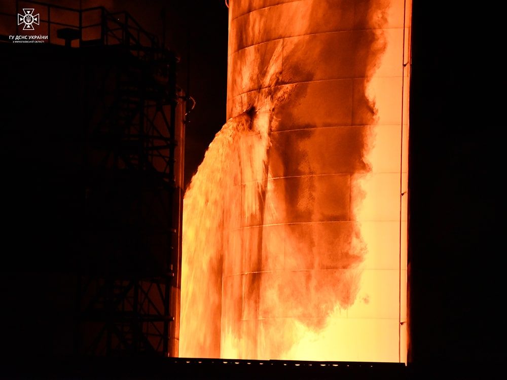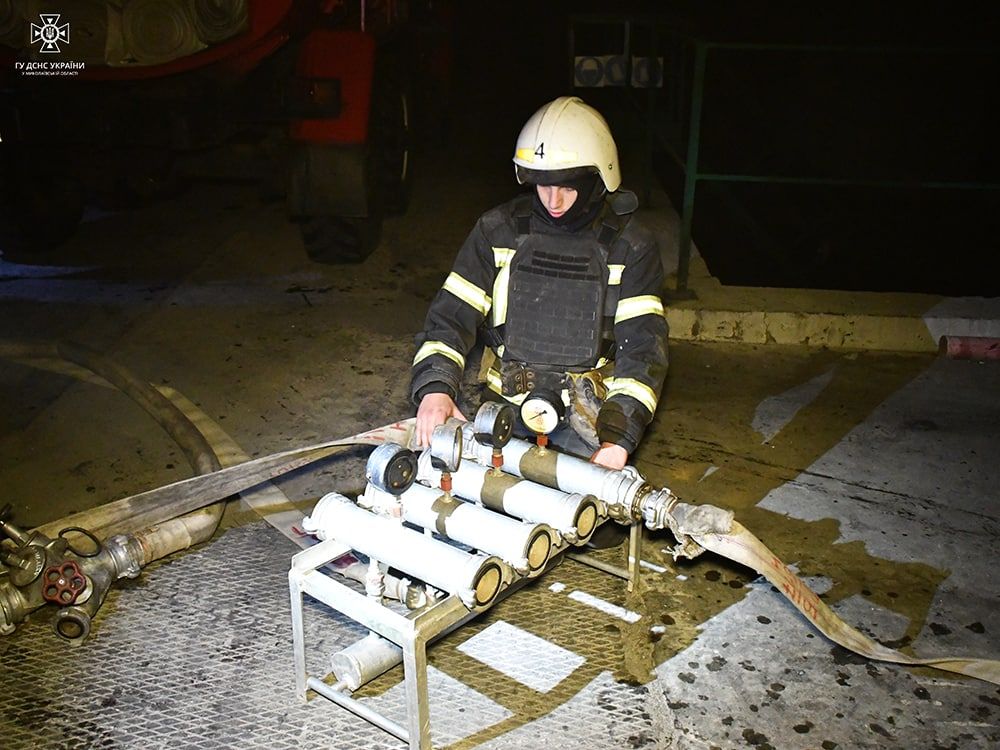 Как пожарные боролись с последствиями удара по резервуару с маслом / Фото ГУ ГСЧС Украины в Николаевской области
