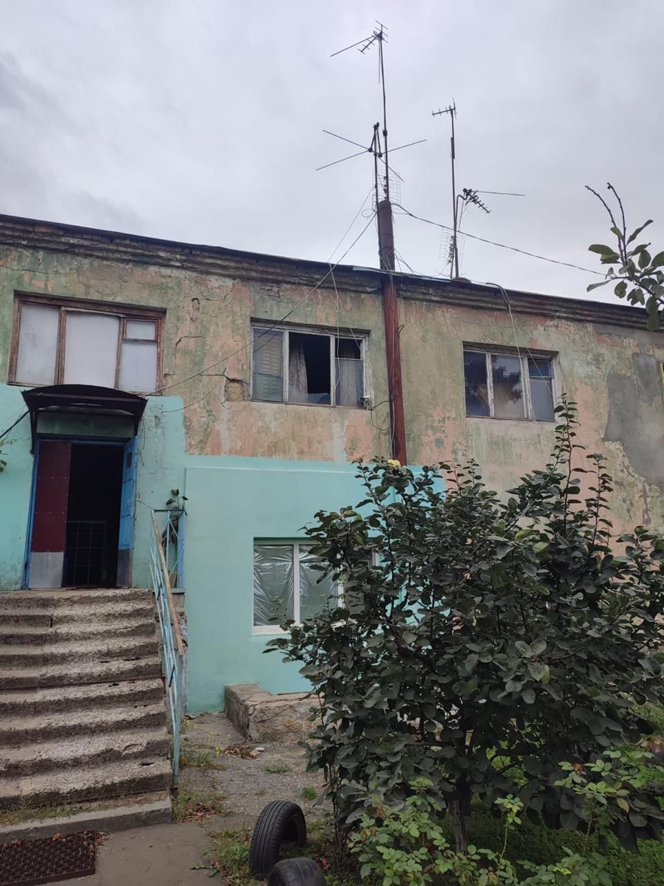 В результате ночной вражеской атаки в доме были выбиты окна в комнатах и местах общего пользования. В горсовете добавили, что всего речь идет о девяти окнах, в течение дня их должны закрыть пленкой.