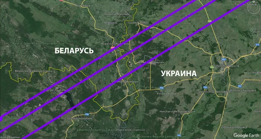 На схеме видно, что скоростные цели или ракеты "Кинжал", запущены над территорией России, вошли в воздушное пространство Черниговской области, пересекли территорию Беларуси над Брагинским районом и продолжили движение над Киевской областью в направлении Запада Украины,