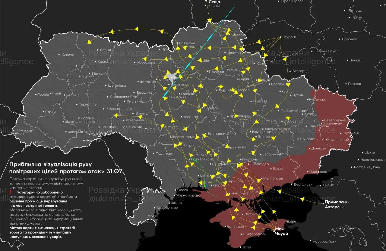 Примерный маршрут "Шахедов" ночью 31 июля / Фото из соцсетей