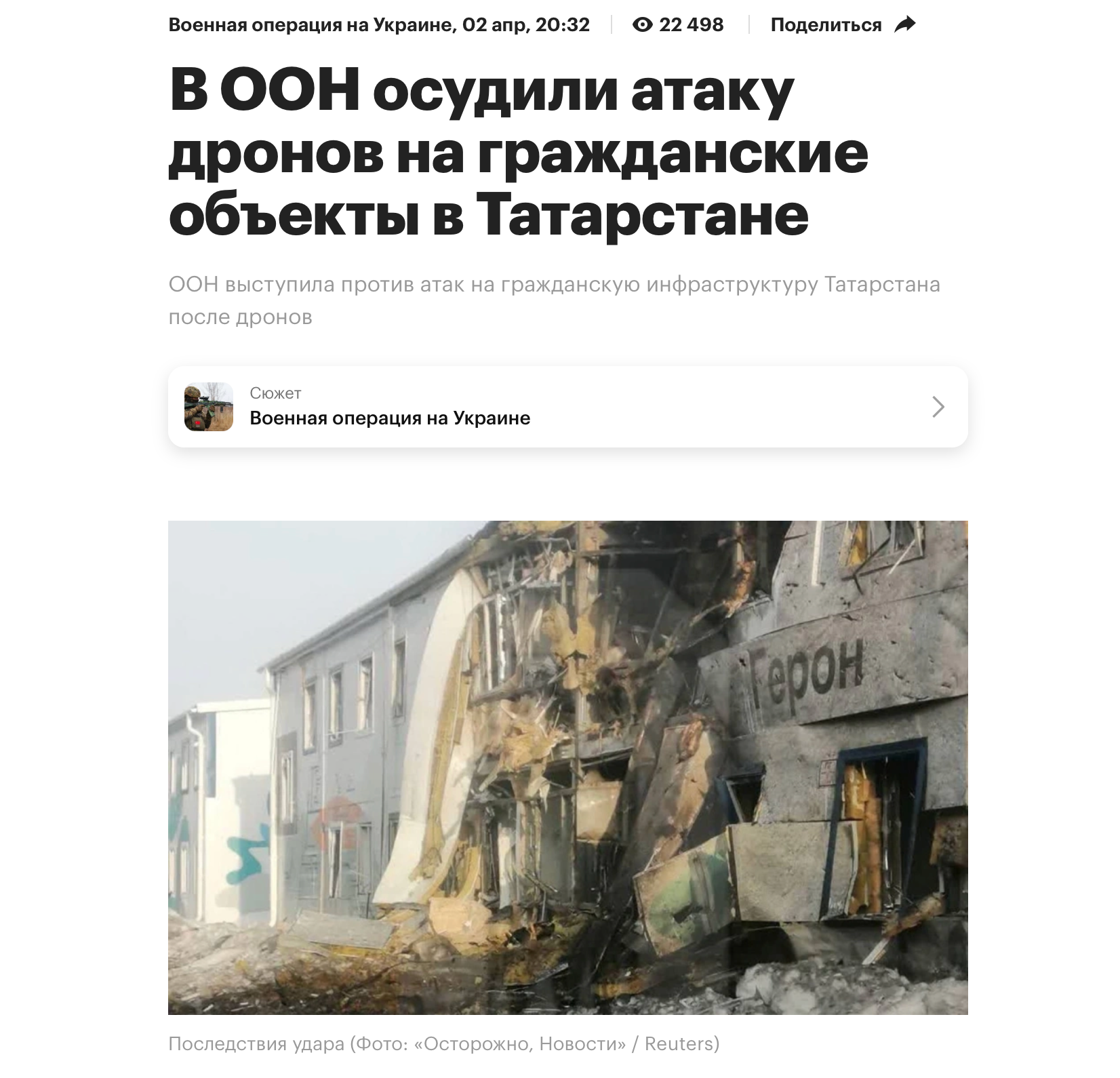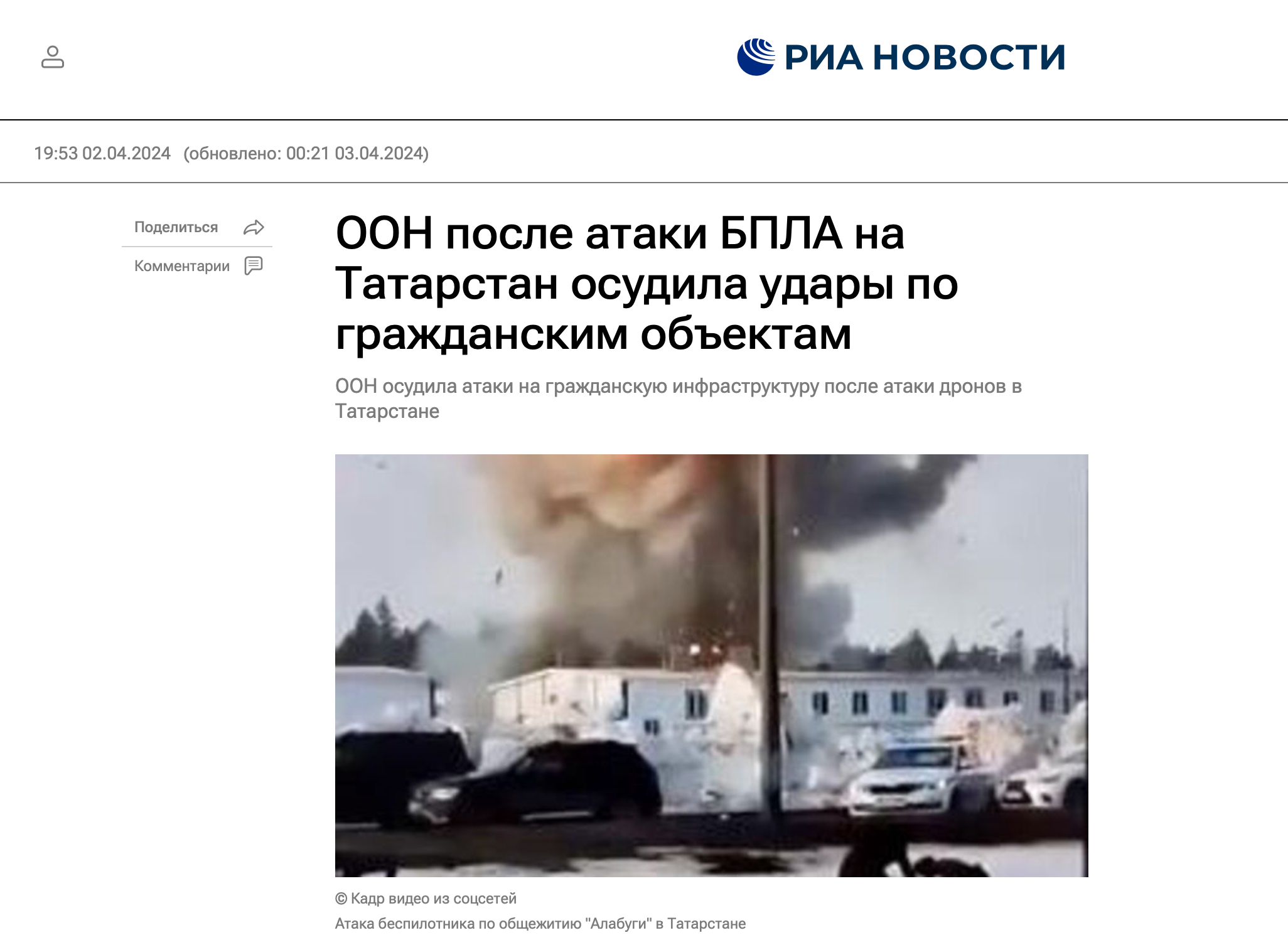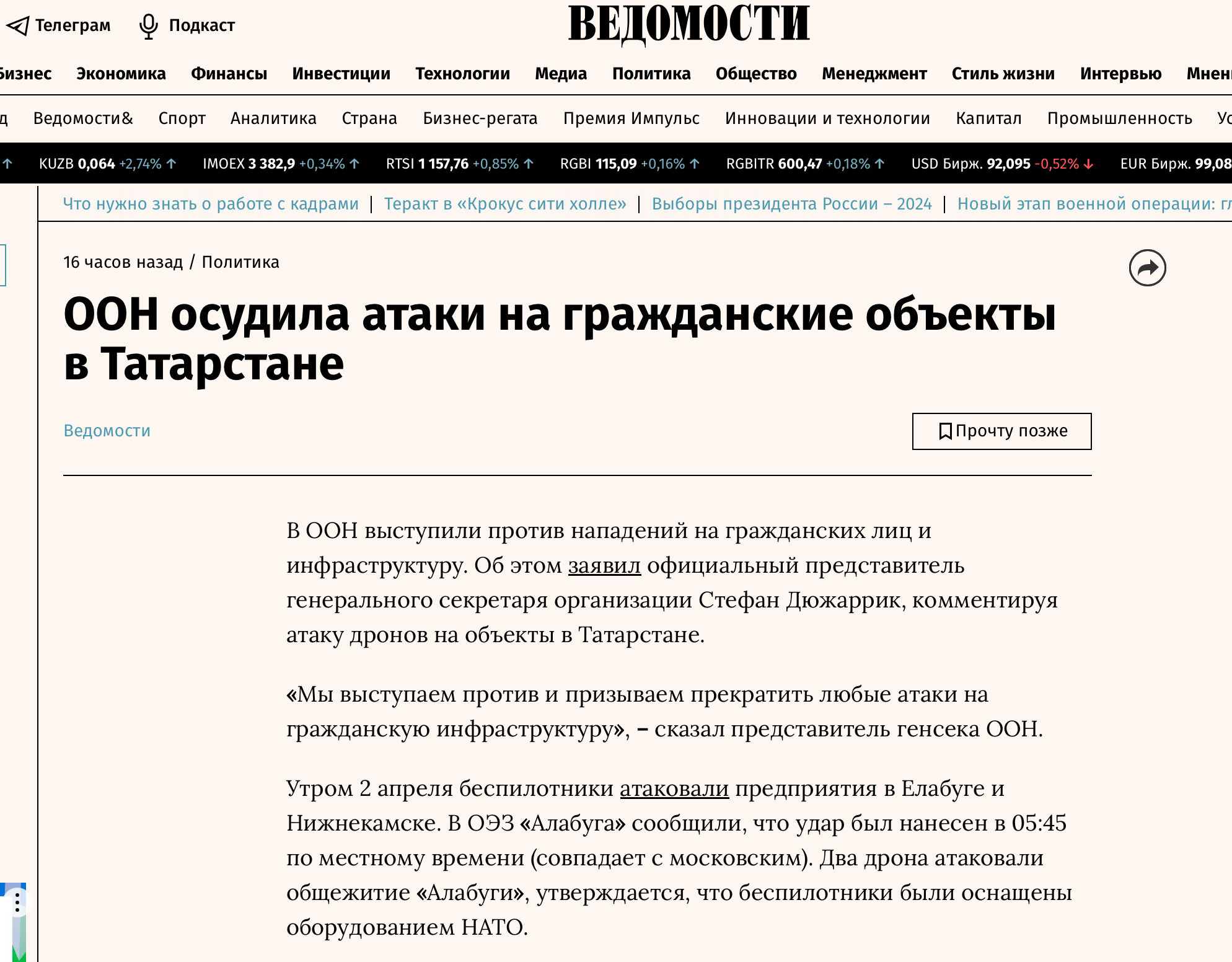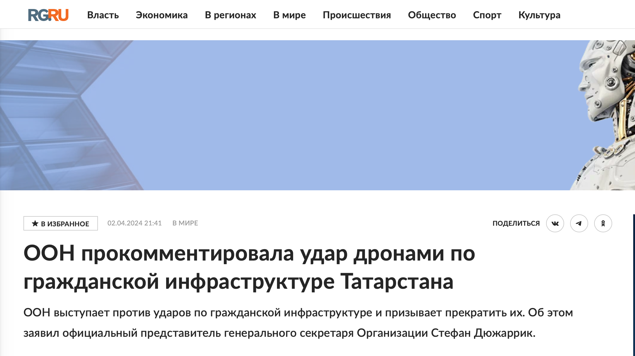 Один из присутствующих журналистов, назвавшийся Денисом, задал вопрос пресс-секретарю Генерального секретаря ООН Стефану Дюжаррику. Он касался “ударов по объектам в Татарстане”. И поскольку в вопросе не было ни одного упоминания о заводе по производству "Шахедов", ответ представителя ООН оказался предсказуемым и лаконичным.