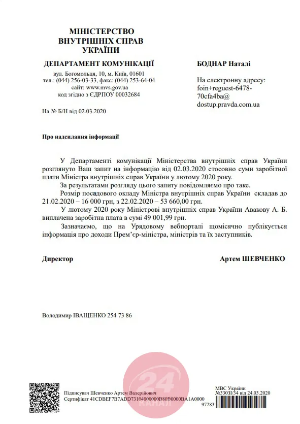 Ответ МВД о зарплате Авакова на запрос 24 канала