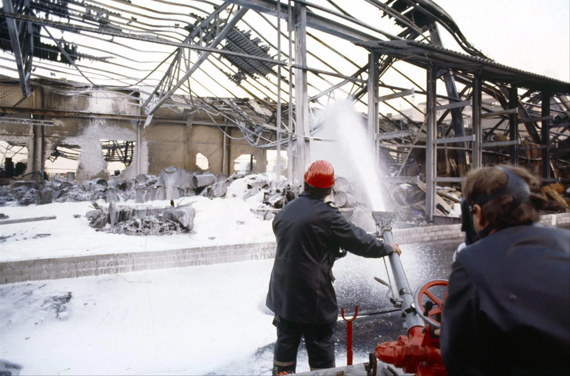 Бочки с ядом на складе взрывались одна за другой. Специальным пожарным подразделениям одновременно приходилось охлаждать и соседние здания, ведь в них хранились контейнеры с фосгеном. Если бы пламя распространилось на эти склады, ядовитый газ мог бы забрать сотни жизней.