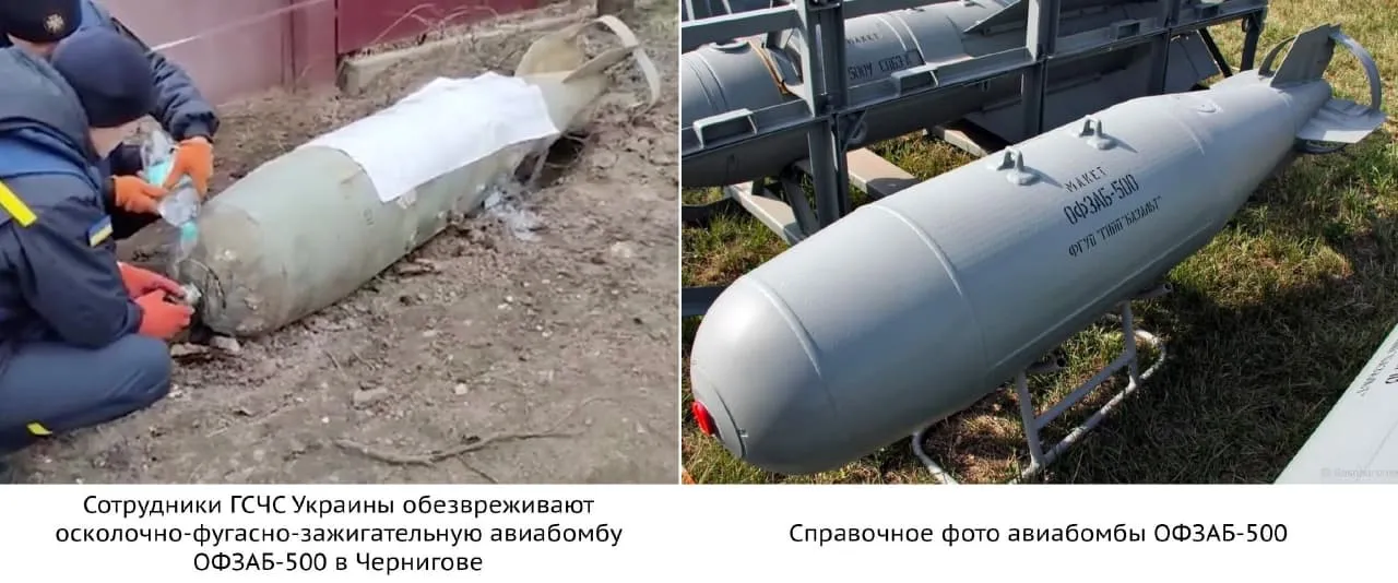 Ранее мы уже наблюдали бомбы ОФЗАБ-500 в Чернигове после сбития российского Су-34 5 марта. Тогда мы не были уверены, что эти бомбы должны были быть сброшены на Чернигов, поскольку они, по-видимому, упали вместе со сбитым самолетом. Однако на этот раз на одной из фотографий ГСЧС видны сработавшие обломки ОФЗАБ-500. Это практически не оставляет сомнений, что эта авиабомба с зажигательным действием использовалась для бомбардировки Чернигова.