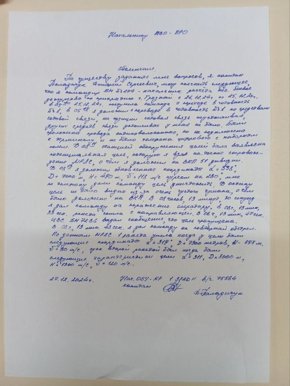В публикации говорится, что команду сбить азербайджанский лайнер отдавал некий "капитан ПВО" Паладичук Дмитрий Сергеевич. По данным письма, поступившего в редакцию, офицер "нес боевое дежурство по прикрытию города Грозный с 24.12.24 по 25.12.24 года".