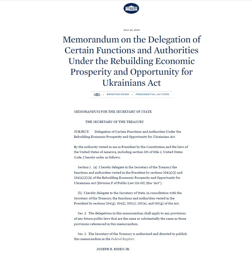 Байден делегировал полномочия по закону о поддержке Украины главам Минфина и Госдепа / Скриншот с сайта Белого дома
