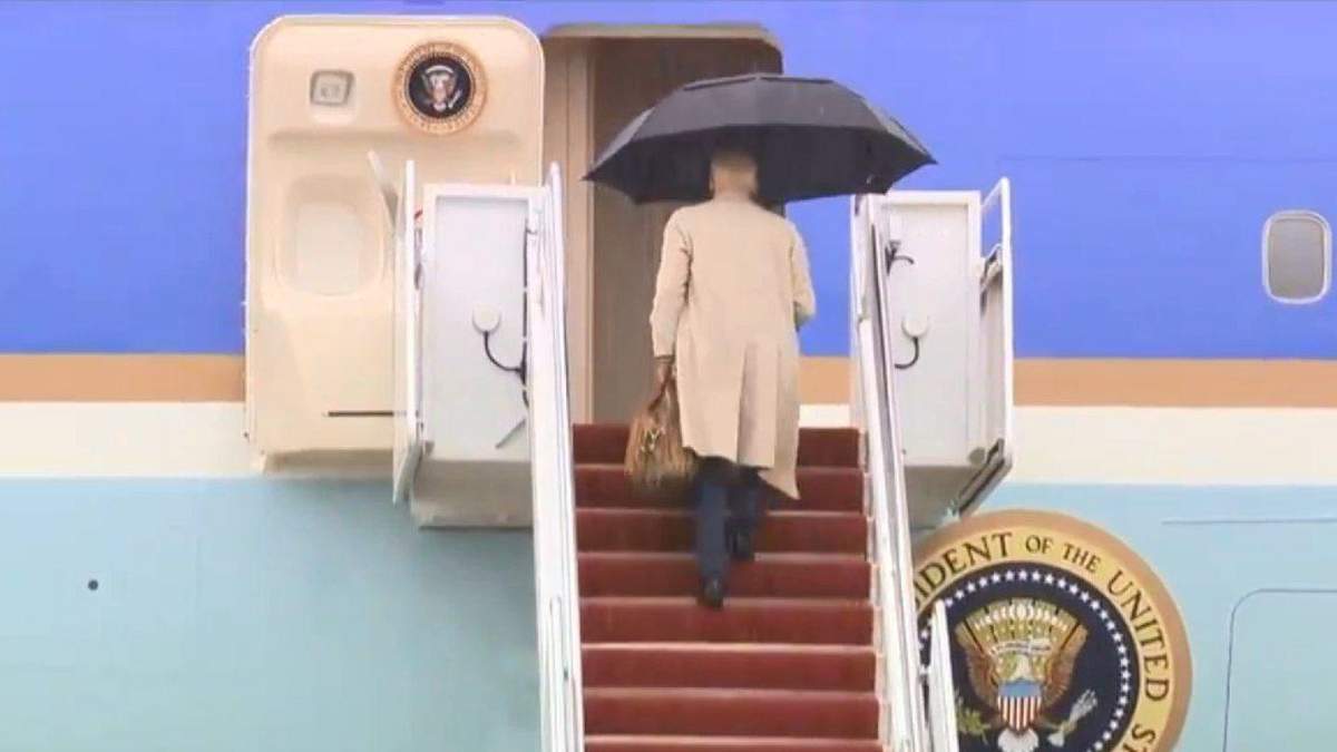 На видео видно, как лидер Штатов поднимается по трапу с зонтиком в руках. Вокруг шел дождь.