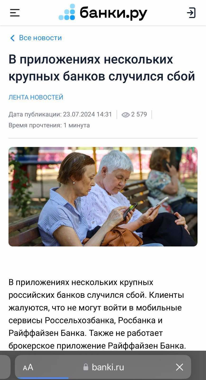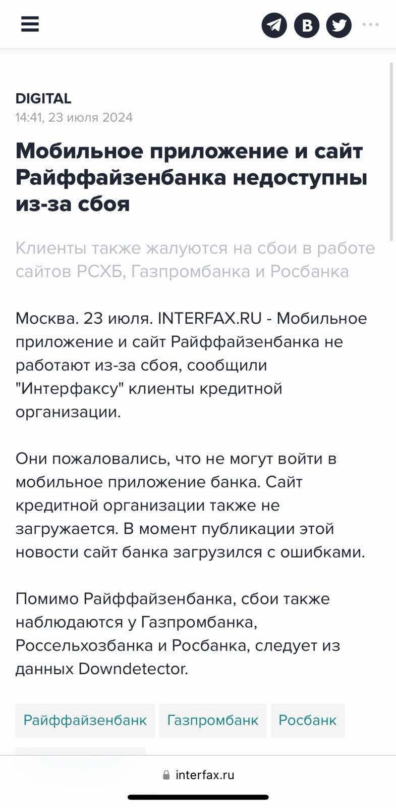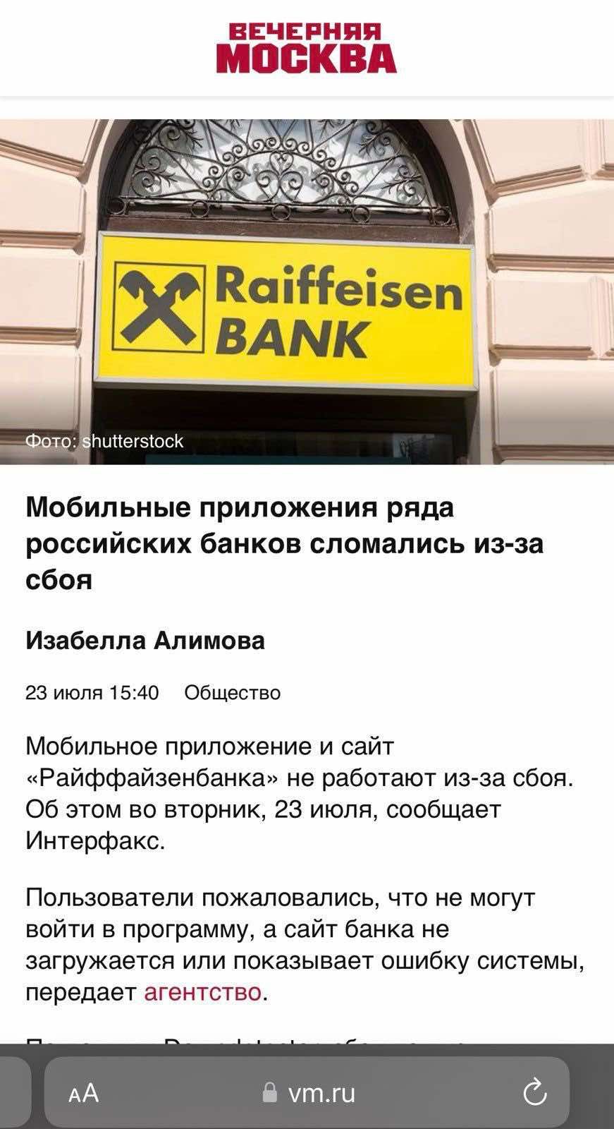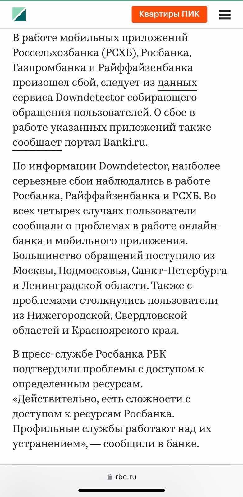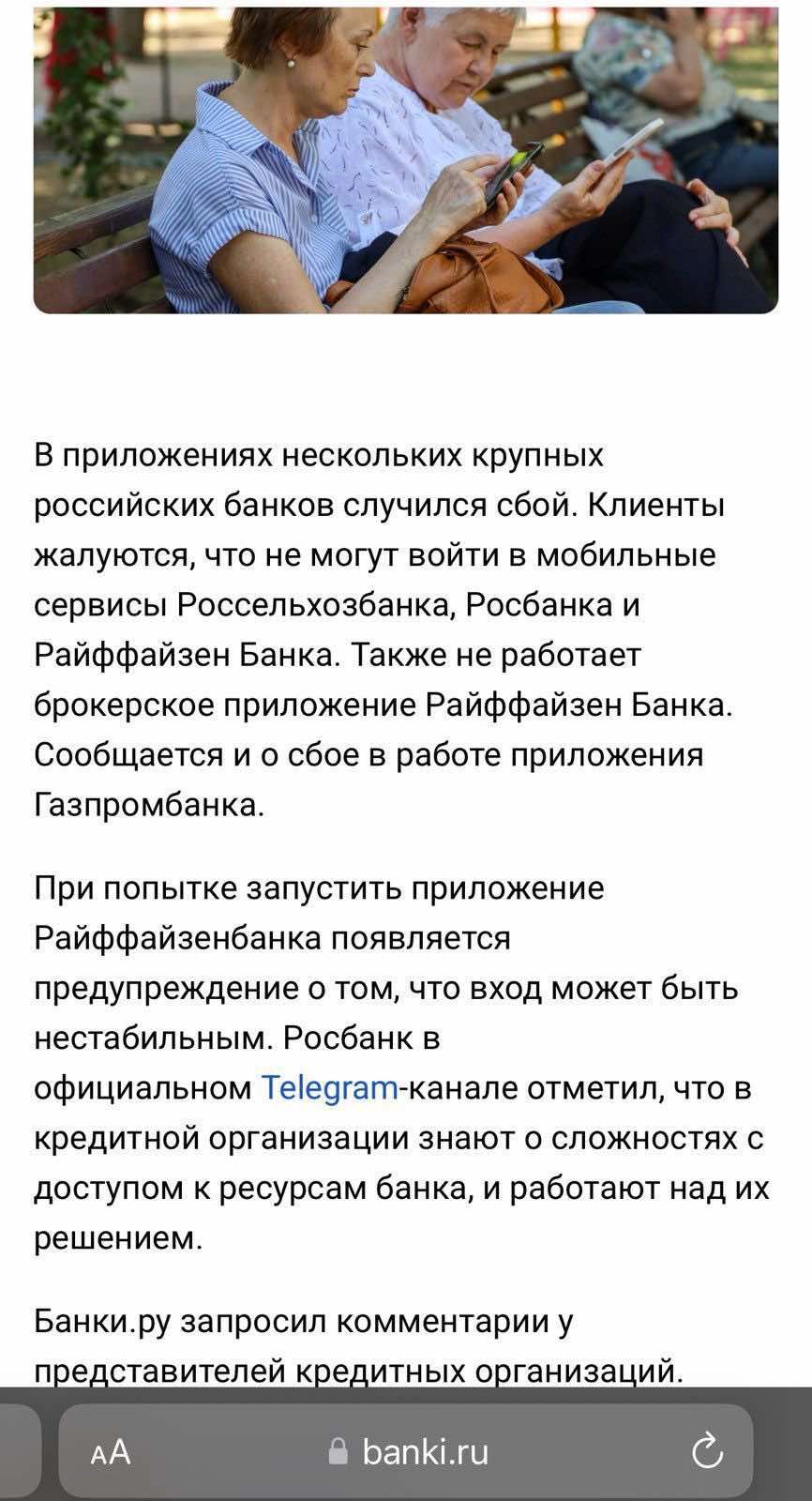 Пользователи на всей территории России жалуются на то, что не могут воспользоваться цифровыми услугами сразу ряда основных банковских учреждений. В частности, онлайн-сервисы не работают или существенно деградировали в "Альфа-банке", "Сбербанке", Райффайзен банке, ВТБ Банке, РСХБ Банке, Газпромбанке, Т-Банке, онлайн-банкинге iBank.