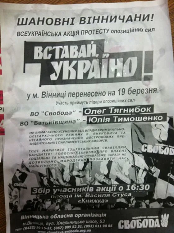 "Сегодня утром в Виннице начали распространяться листовки, радио-и Интернет-сообщения о якобы переносе времени проведения марша и митинга в рамках акции " Вставай, Украина! " на 19 марта", - говорится в сообщении партии.