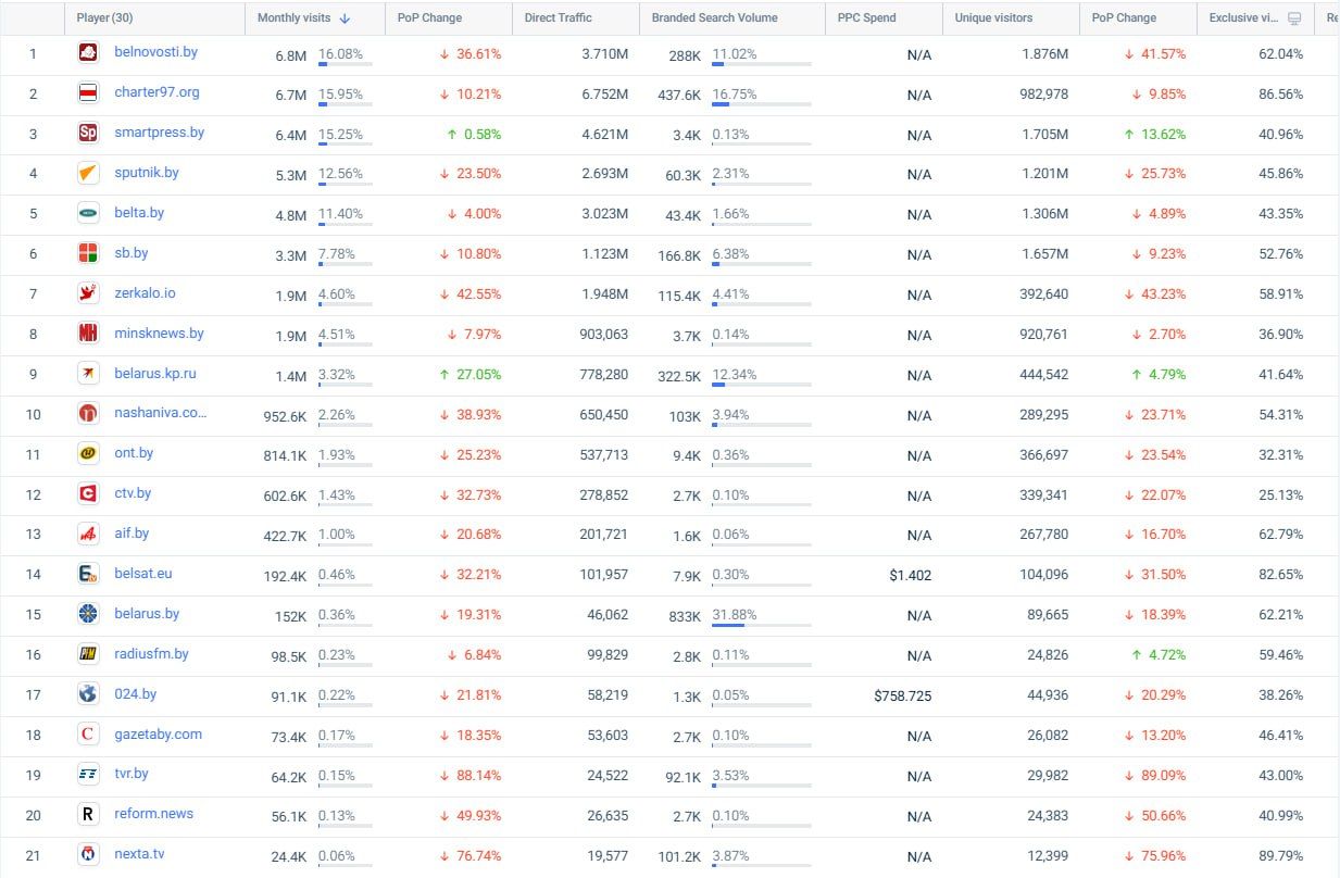 Собранные и проанализированные данные из программ веб-аналитики SimilarWeb и Ahrefs показывают существенный дисбаланс в медийном ландшафте Беларуси. Более половины посещений новостных веб-сайтов приходится на проправительственные издания, тогда как международные независимые медиа фактически остаются маргинальными. Приведенные ниже данные – среднемесячные по данным SimilarWeb за последние полгода.