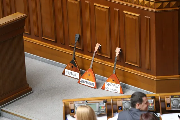На инструментах прикреплены имена нардепов – Борислава Березы, Дмитрия Добродомова, Сергея Каплина. По словам Березы, эти люди защищают и поддерживают политику телеканала "Интер".