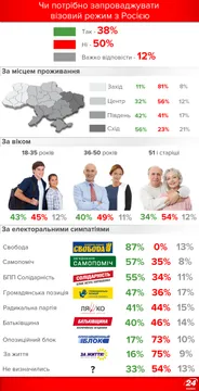 Отношение украинцев к идее введения визового режима с Россией очень похоже – "за" выступает 38% опрошенных, а "против" – 50%. Сторонников такой идеи больше среди молодежи, а в географическом разрезе – на западе Украины.