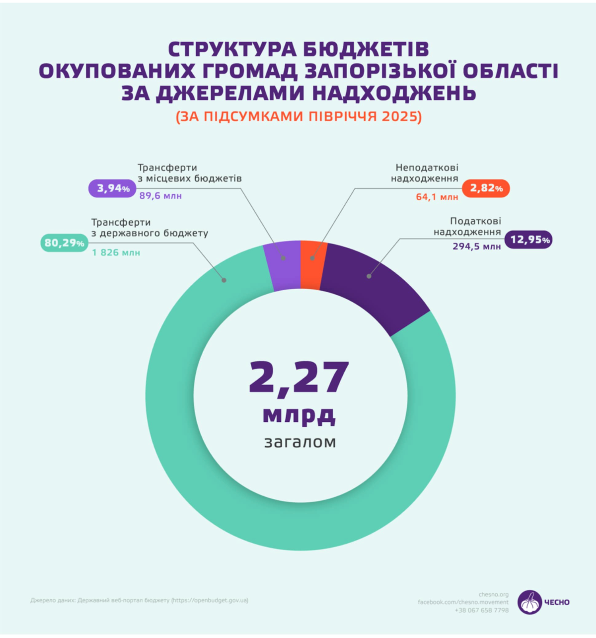 Бюджеты оккупированных общин Запорожья на 80% зависимы от государственных трансфертов. Потеря налоговой базы, коммунального имущества и предприятий делает бюджетный процесс преимущественно формальным.