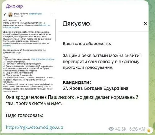 Правоту слов Гудыменко косвенно подтвердил телеграм-канал "Джокер", который опубликовал скрин сообщения о голосовании за кандидатку Дану Яровую в 8:36, хотя голосование должно было начаться в 9.00.