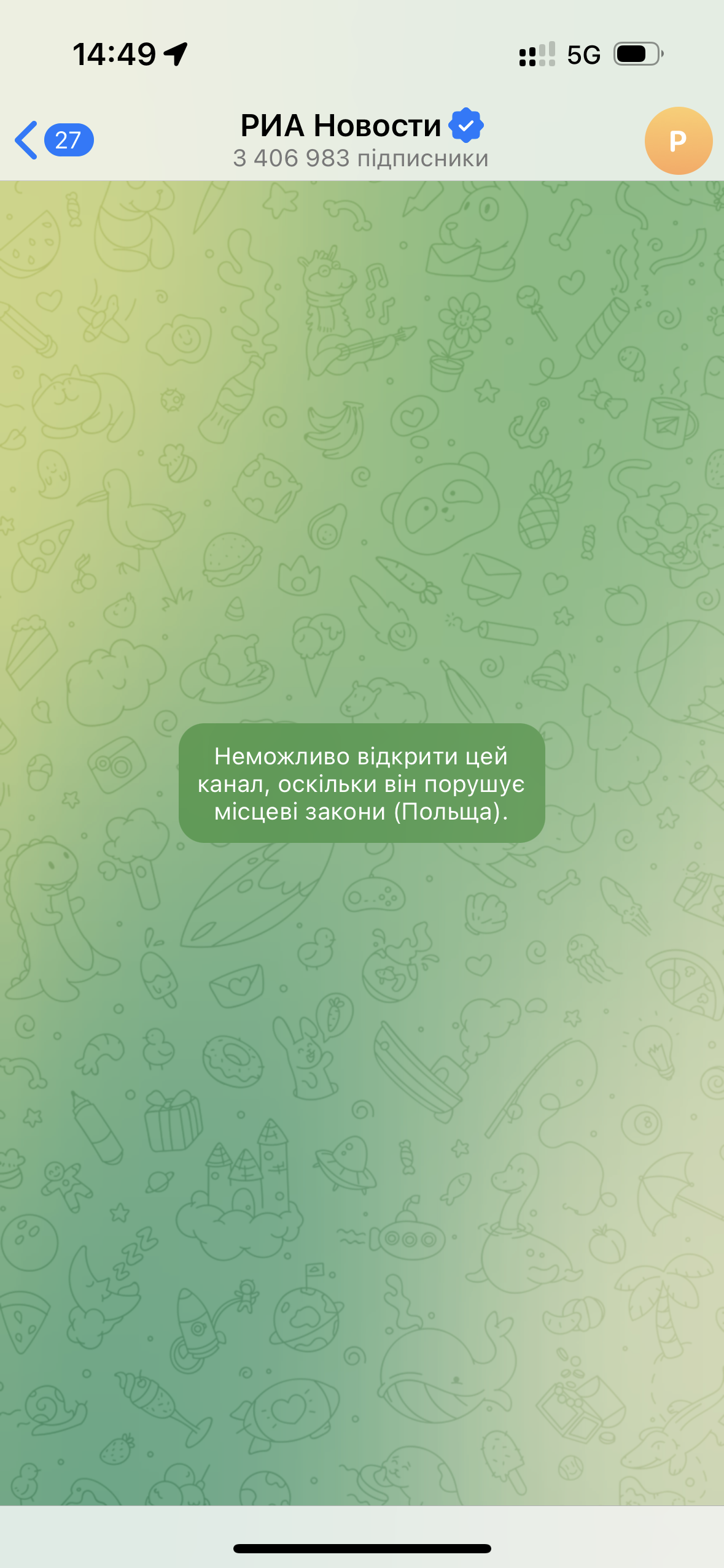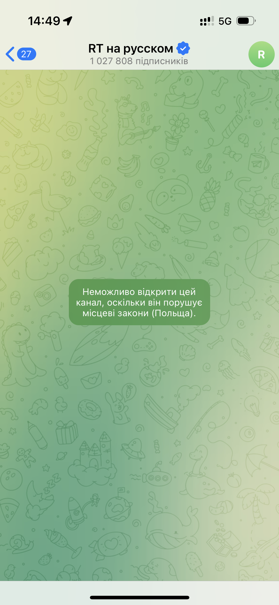 В Европе Telegram начал массово блокировать крупнейшие российские пропагандистские новостные каналы. Отмечается, что ограничения затронули такие ресурсы, как "Риа Новости", НТВ, "Россия 1", RT, "Известия".