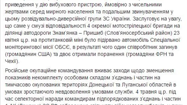 В ГУР отмечают, что осуществляет это так называемая 4 отдельная мотострелковая бригада (Алчевск) 2 АК ВС РФ. Именно в районе их деятельности на противотанковой мине был подорван автомобиль Специальной мониторинговой миссии ОБСЕ. Тогда один наблюдатель погиб, еще двое получили ранения.