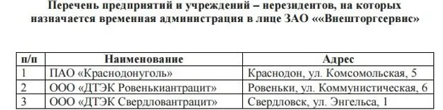 Все предприятия зарегистрированы на свободной территории Украины. Речь идет о фирмах, принадлежащих олигарху Ринату Ахметову: ПАО "Краснодонуголь", ООО ДТЭК "Ровенькиантрацит" и ООО ДТЭК "Свердловантрацит".