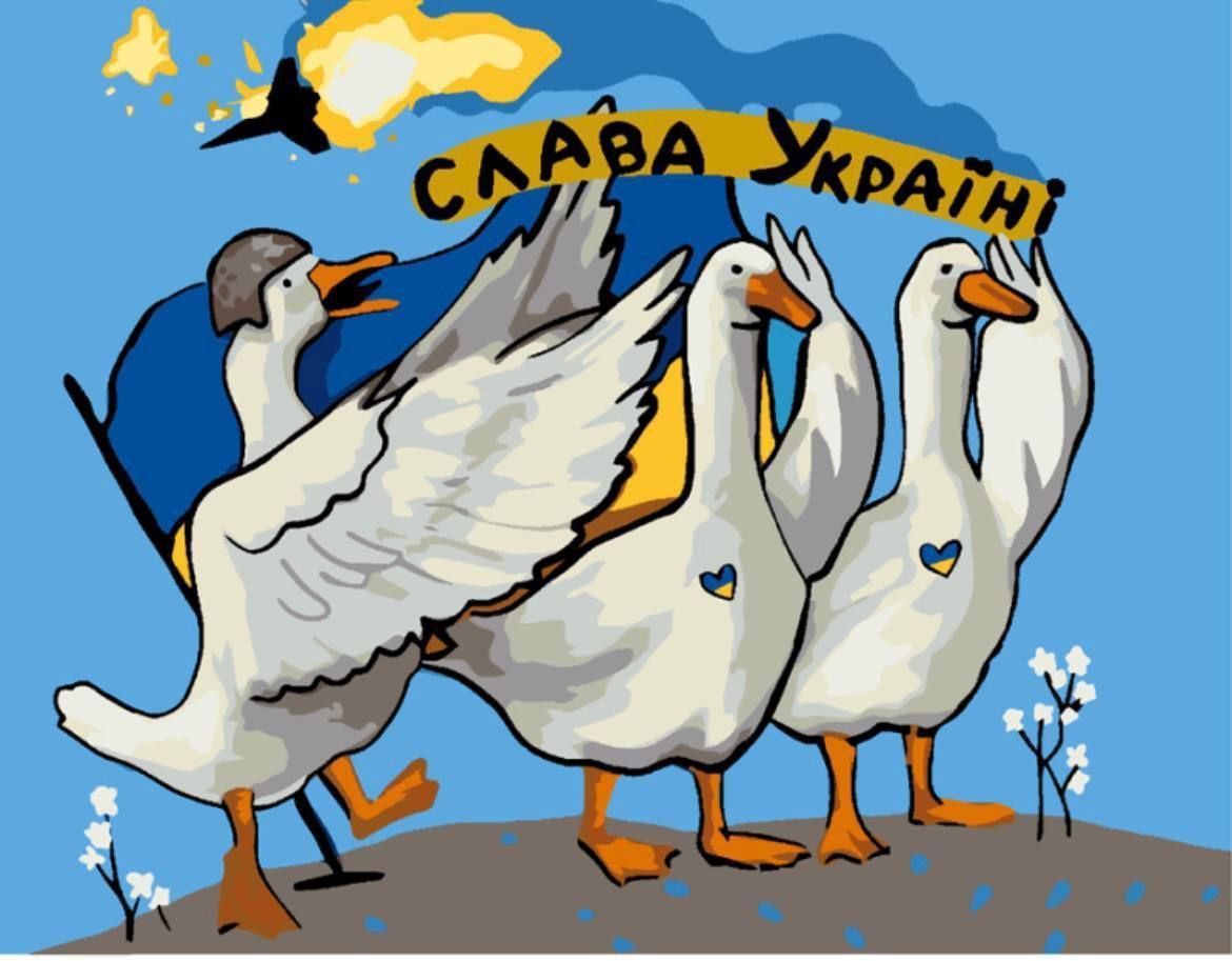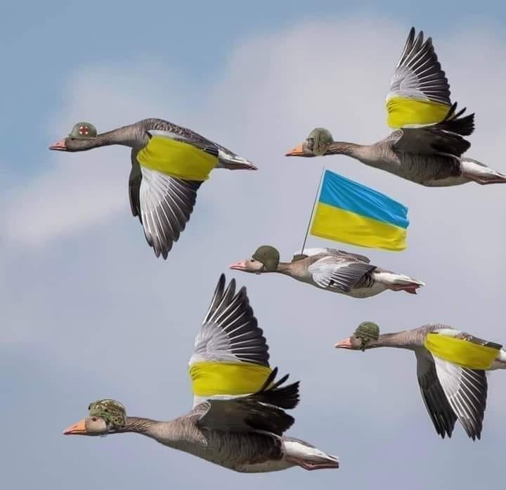 Телеграмм-каналы активно распространяют мемы о боевых птицах, которые якобы стали причиной падения российского самолета. В частности, показали боевых гусей в шлемах и с Украиной в сердце. Кстати, стая этих птиц уничтожили российский вертолет в Херсонской области.