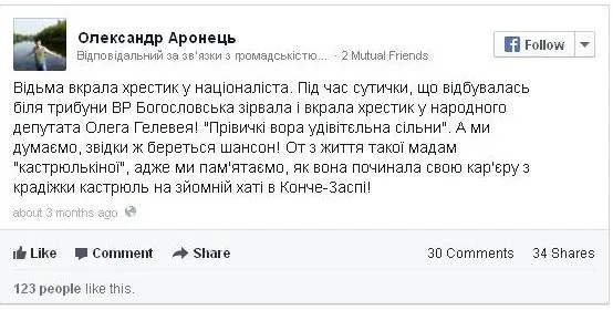 Ей не понравилось сообщение Аронца в Facebook и Twitter о том, что во время одной из стычек в Верховной Раде она украла нательный крестик у депутата Олега Гелевея.