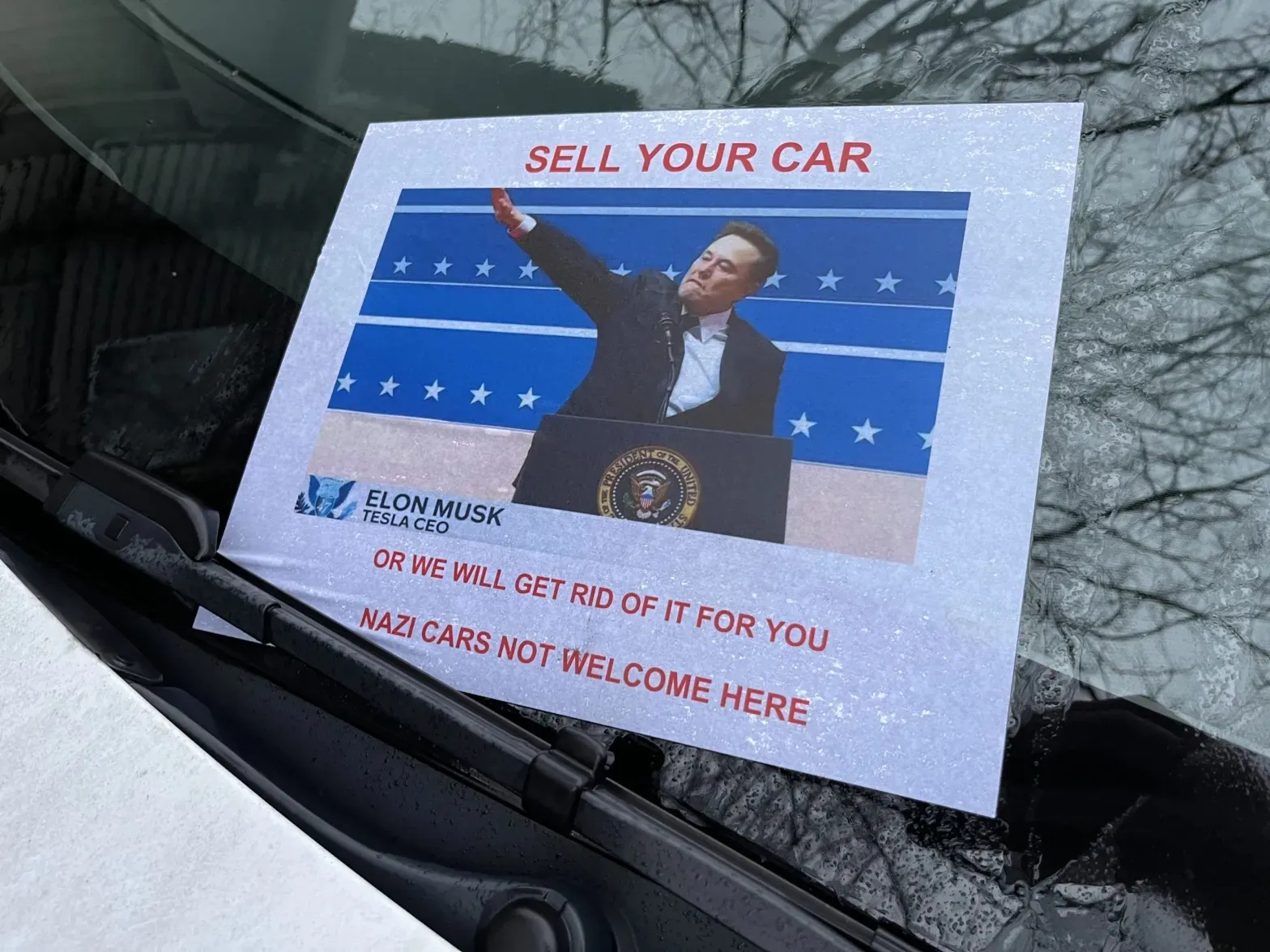 2 февраля Джон Ратто увидел на лобовом стекле Tesla в районе Рокридж в Окленде листовку, на которой был изображен Маск в нацистском приветствии с подписью: "Продай свою машину или мы избавимся от нее за тебя. Нацистским авто здесь не место".