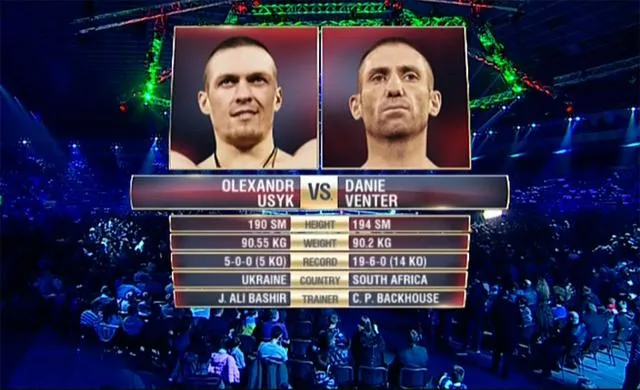 Усик умело уклоняется от ударов Вентера. Соперники действуют осторожно. Публика требует от нашего спортсмена более активных действий. Соперники обменялись ударами — ощутимый левый боковой от нашего боксера. Бой становится интереснее.
