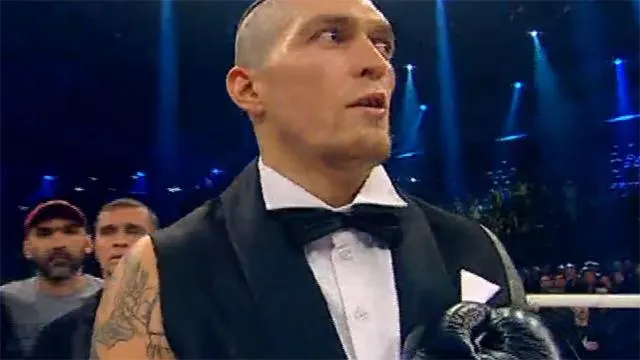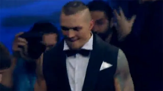 Во казацкие мотивы и овации публики с бабочкой на шее и трезубцем на спине появляется Александр Усик.