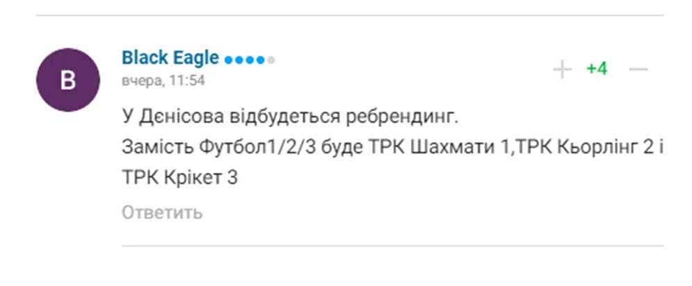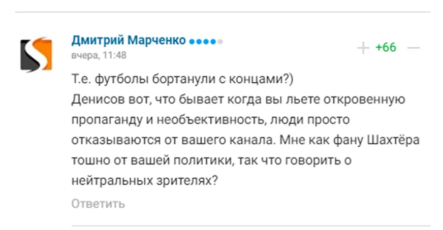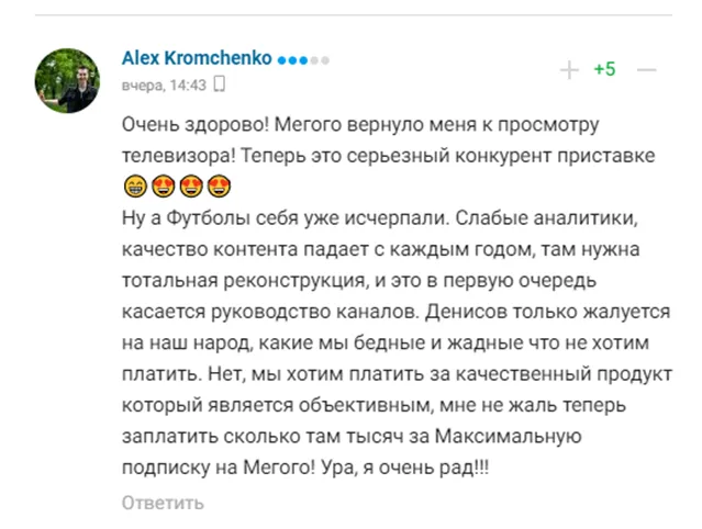 "Футбол" себя уже исчерпали. Слабые аналитики, качество контента падает с каждым годом, там нужна тотальная реконструкция, и это в первую очередь касается руководства каналов. Денисов только жалуется на наш народ, какие мы бедные и жадные, что не хотим платить. Нет, мы хотим платить за качественный продукт, который является объективным", – написал Алекс Кромченко.
