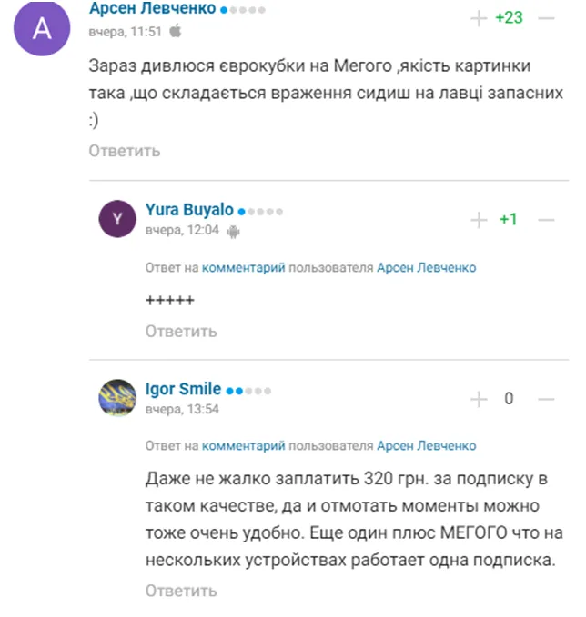 "Сейчас смотрю еврокубки на Мегого, качество картинки такое, что создается впечатление, что сидишь на скамейке запасных", – написал зритель Арсен Левченко в комментарии к новости.