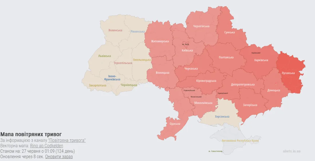 Карта воздушных тревог по состоянию на 1:09 / Скриншот alerts.in.ua