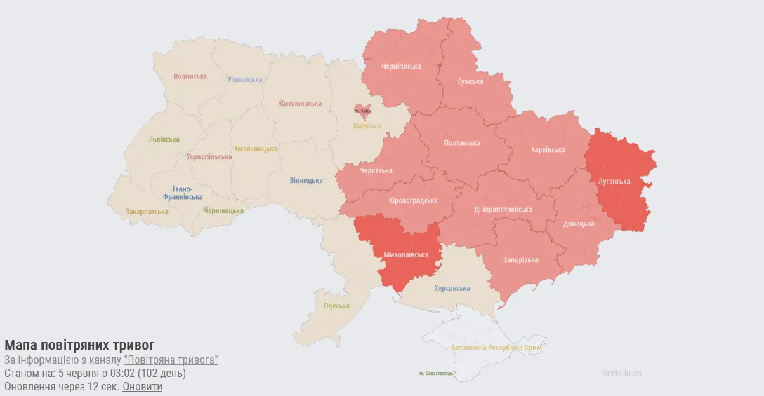 Карта воздушных тревог по состоянию на 3:02 5 июня / Скриншот alerts.in.ua