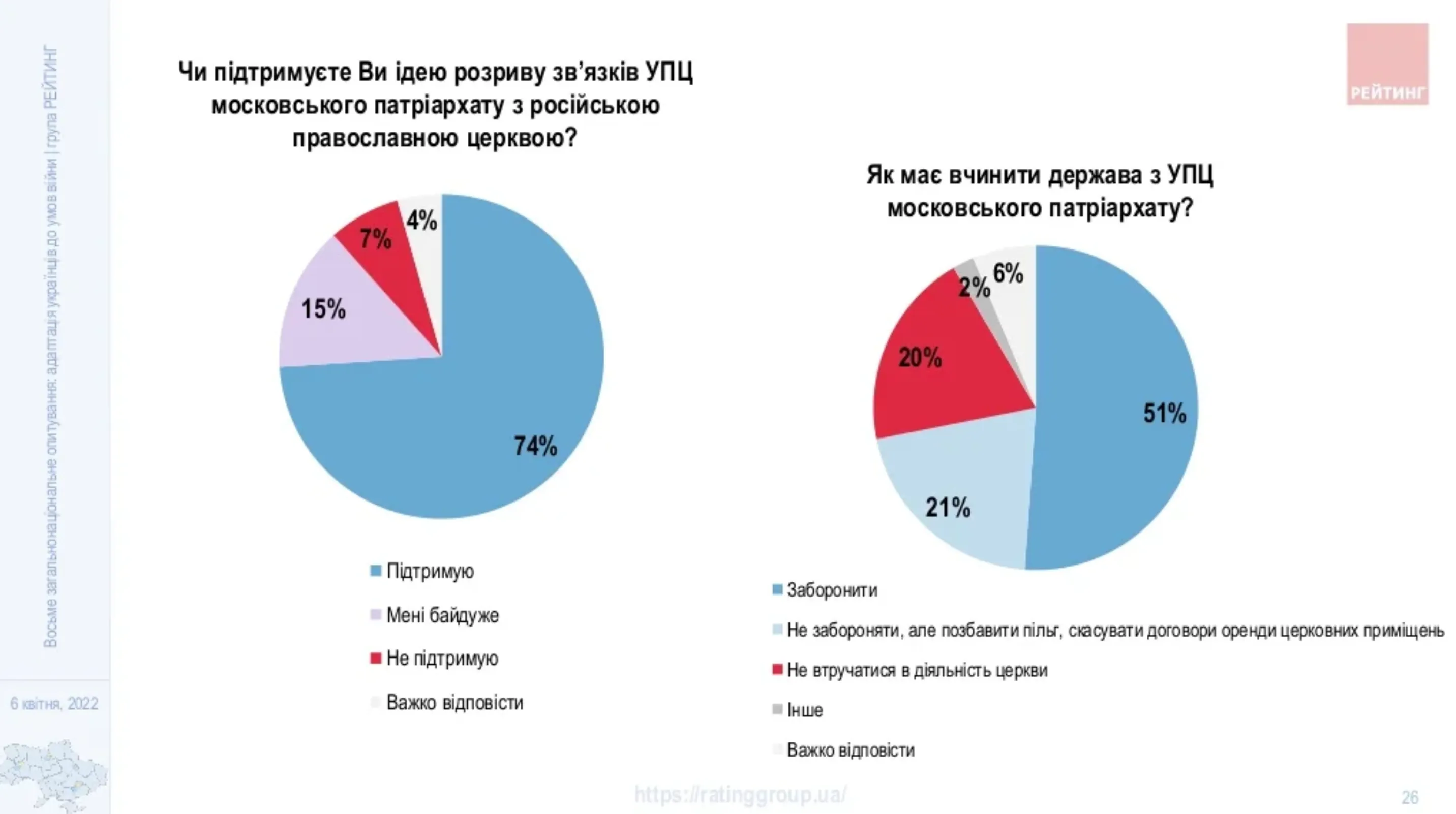 Кроме того, половина опрошенных, 51%, считают, что государство должно запретить деятельность УПЦ МП на территории Украины. Известно, что запрет поддерживают две трети опрошенных жителей Запада и лишь 29% – Востока.